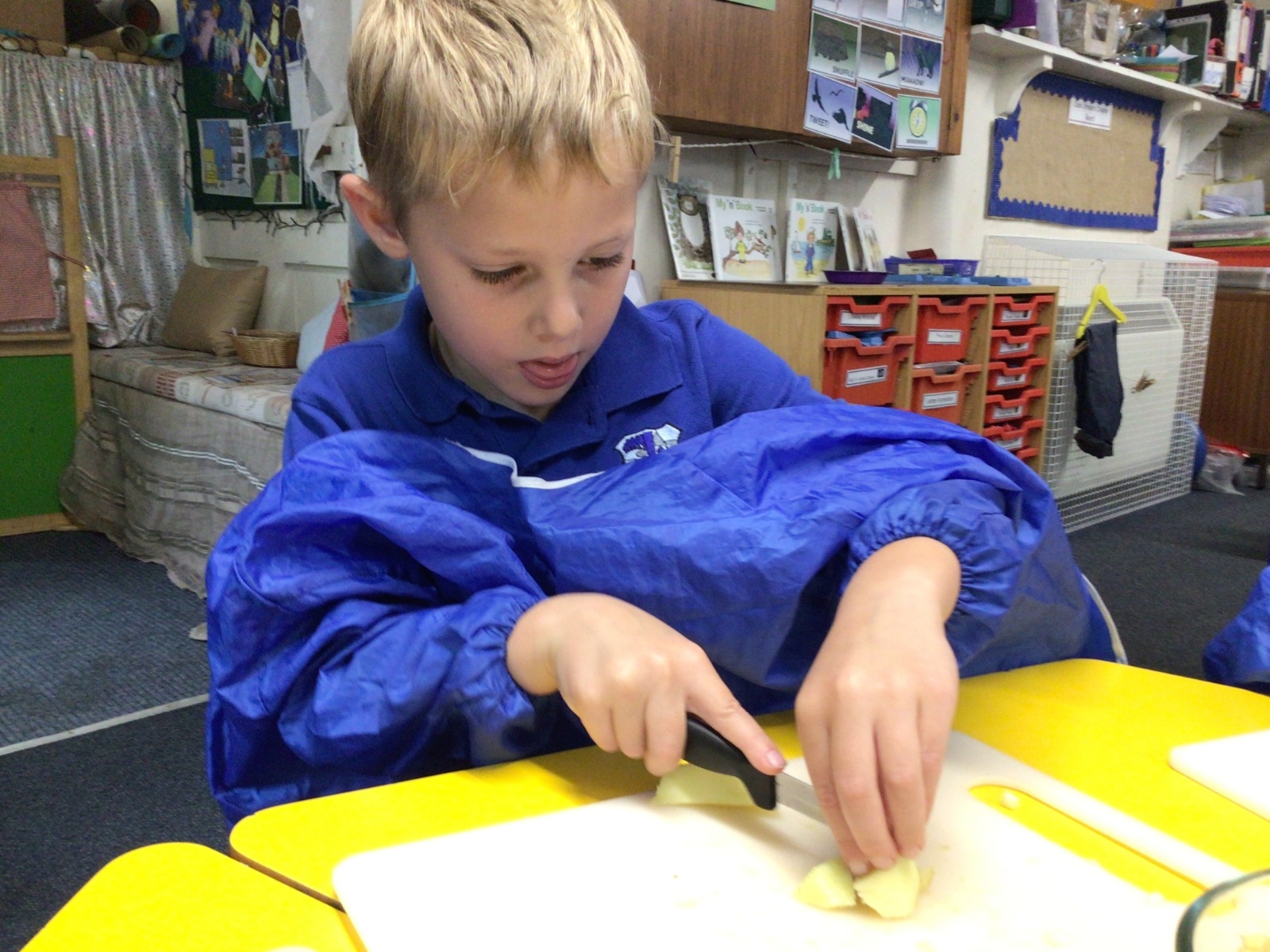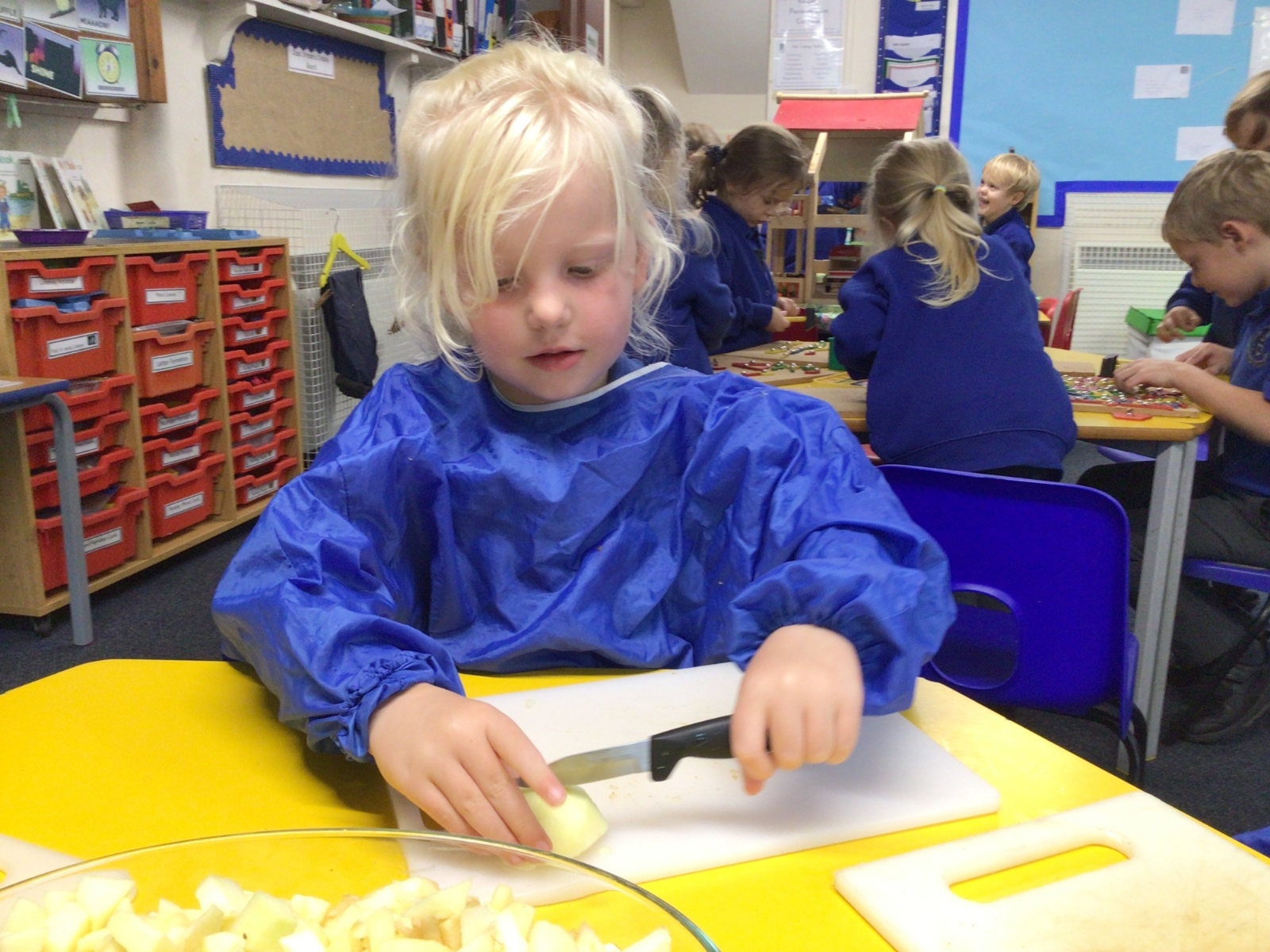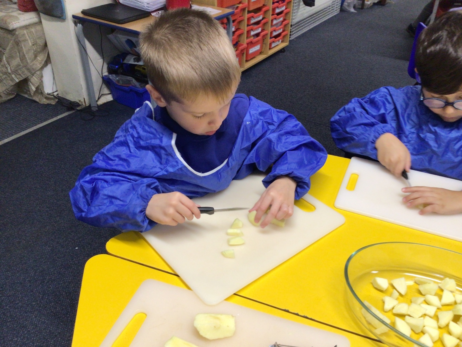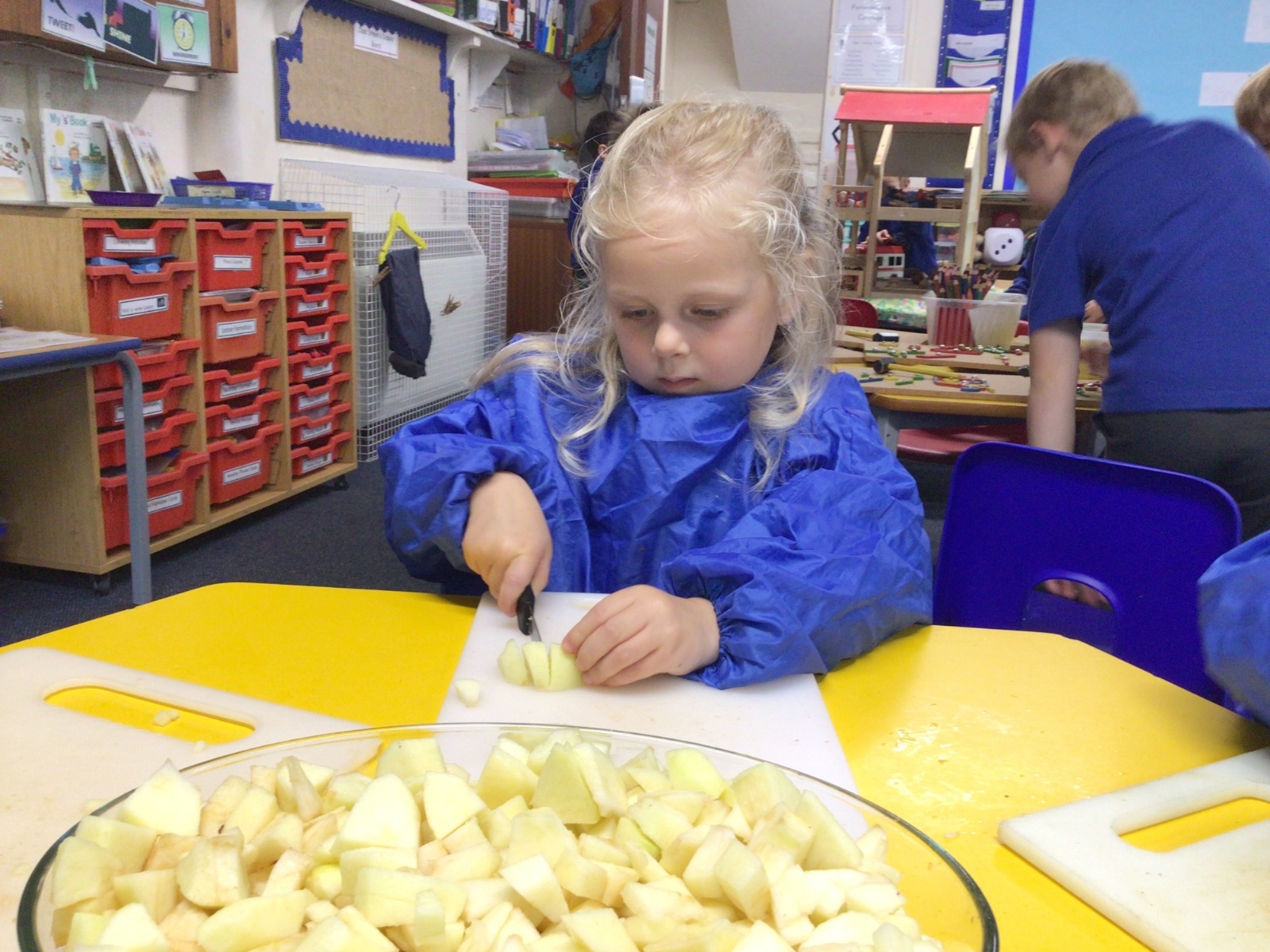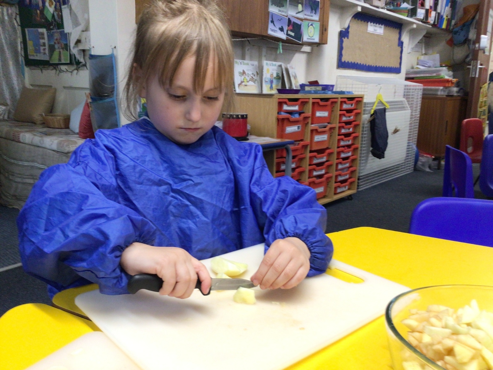 Year 1 picked blackberries and and then we all chopped apples to make a tasty, delicious crumble. We learnt how to chop carefully by making our fingers into a 'claw' and 'bridge'. It was yummy!!