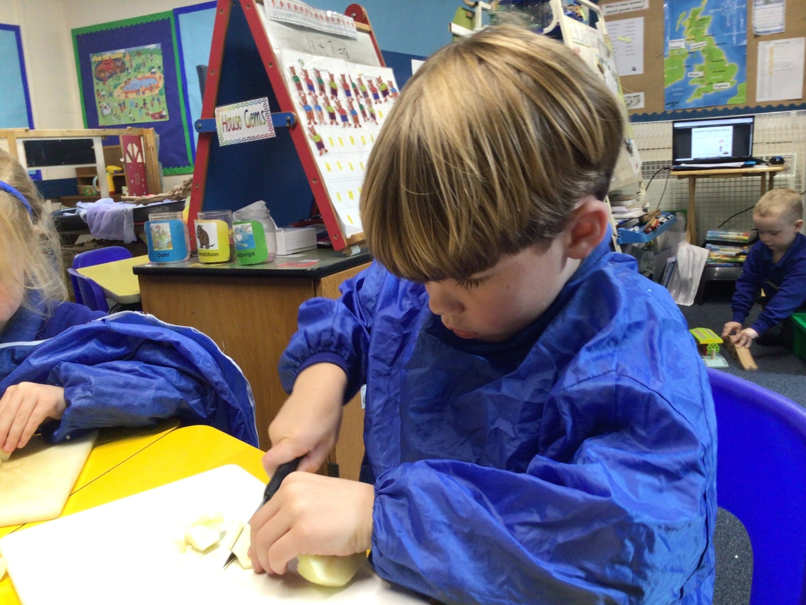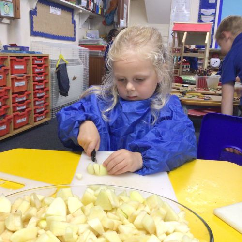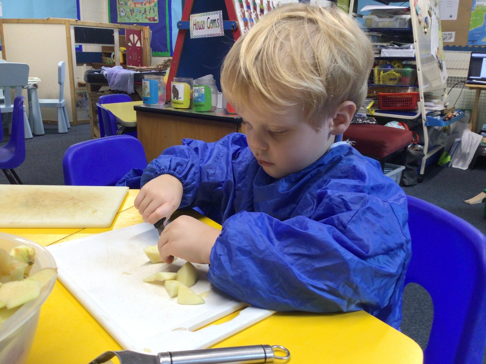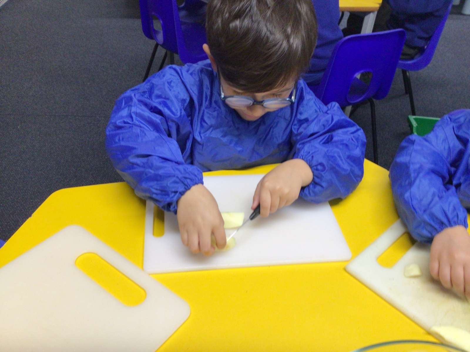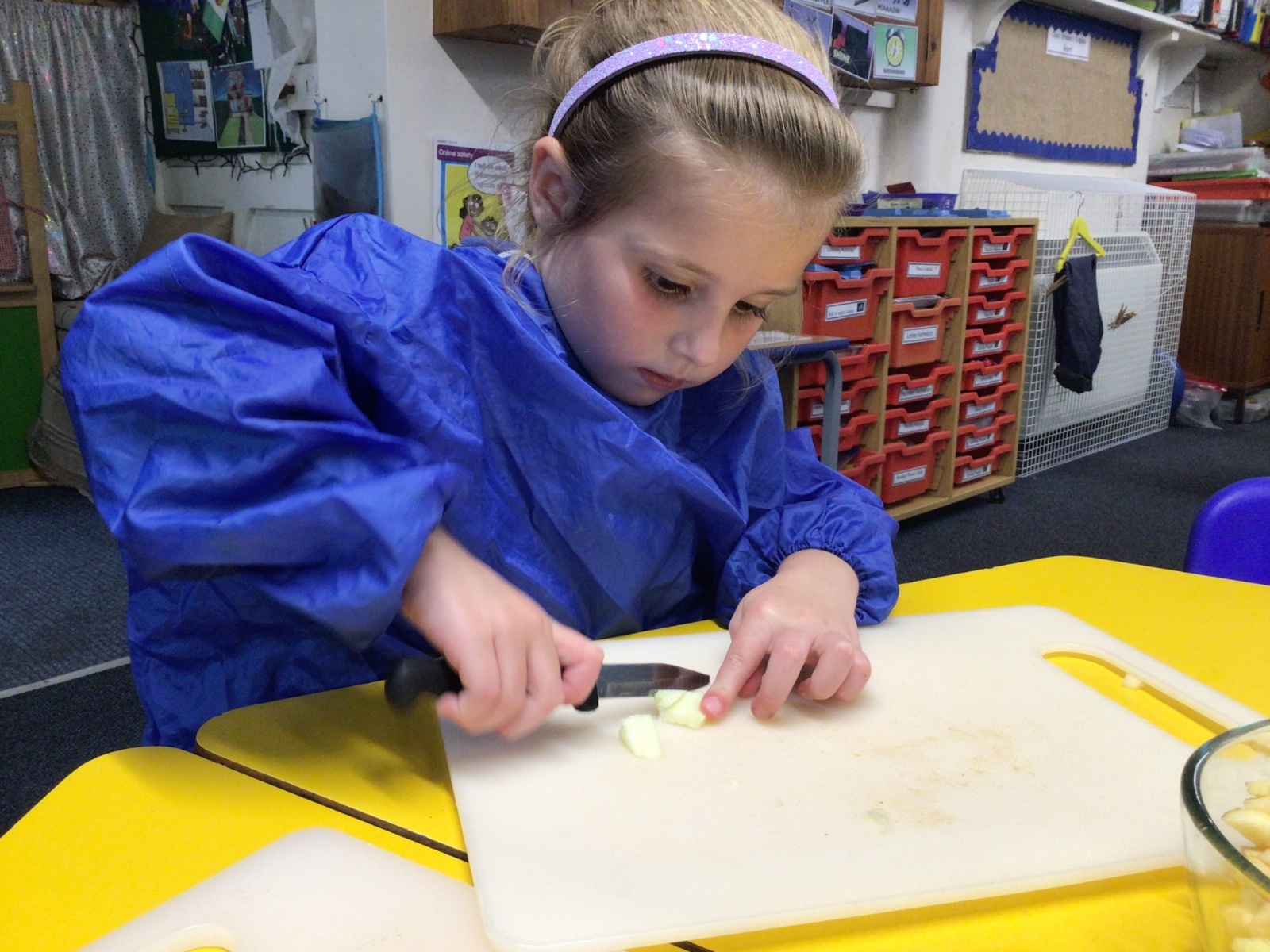 Year 1 picked blackberries and and then we all chopped apples to make a tasty, delicious crumble. We learnt how to chop carefully by making our fingers into a 'claw' and 'bridge'. It was yummy!!