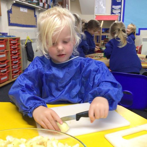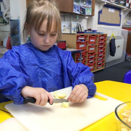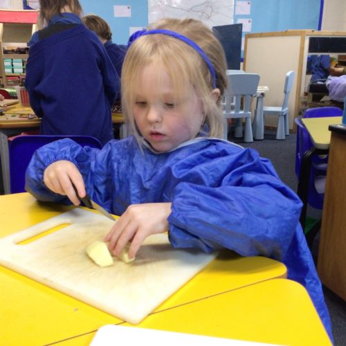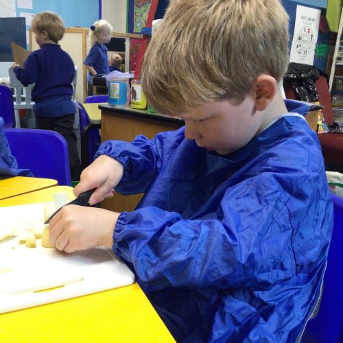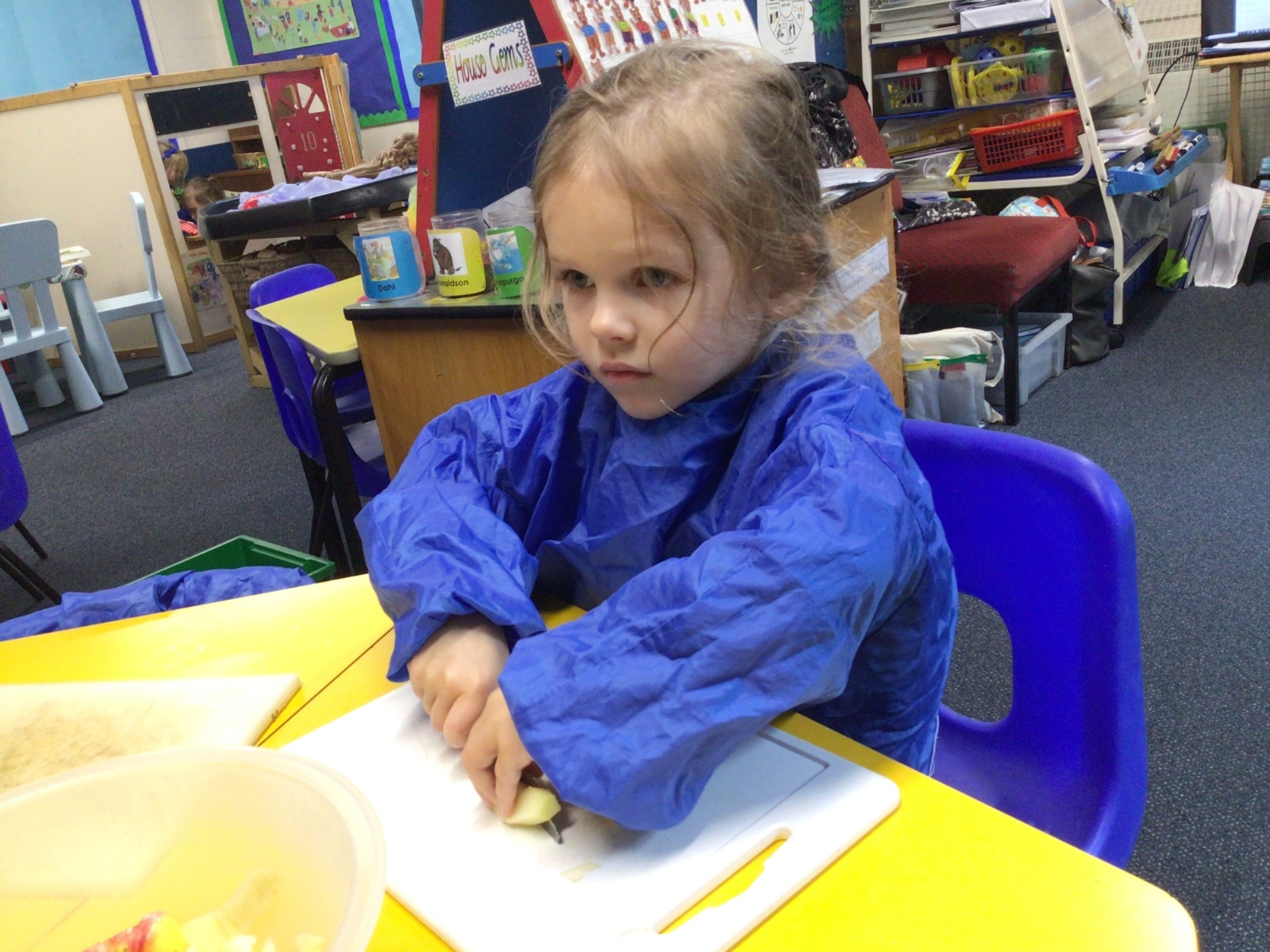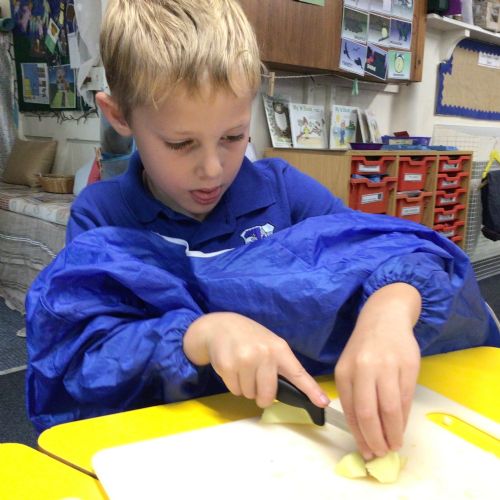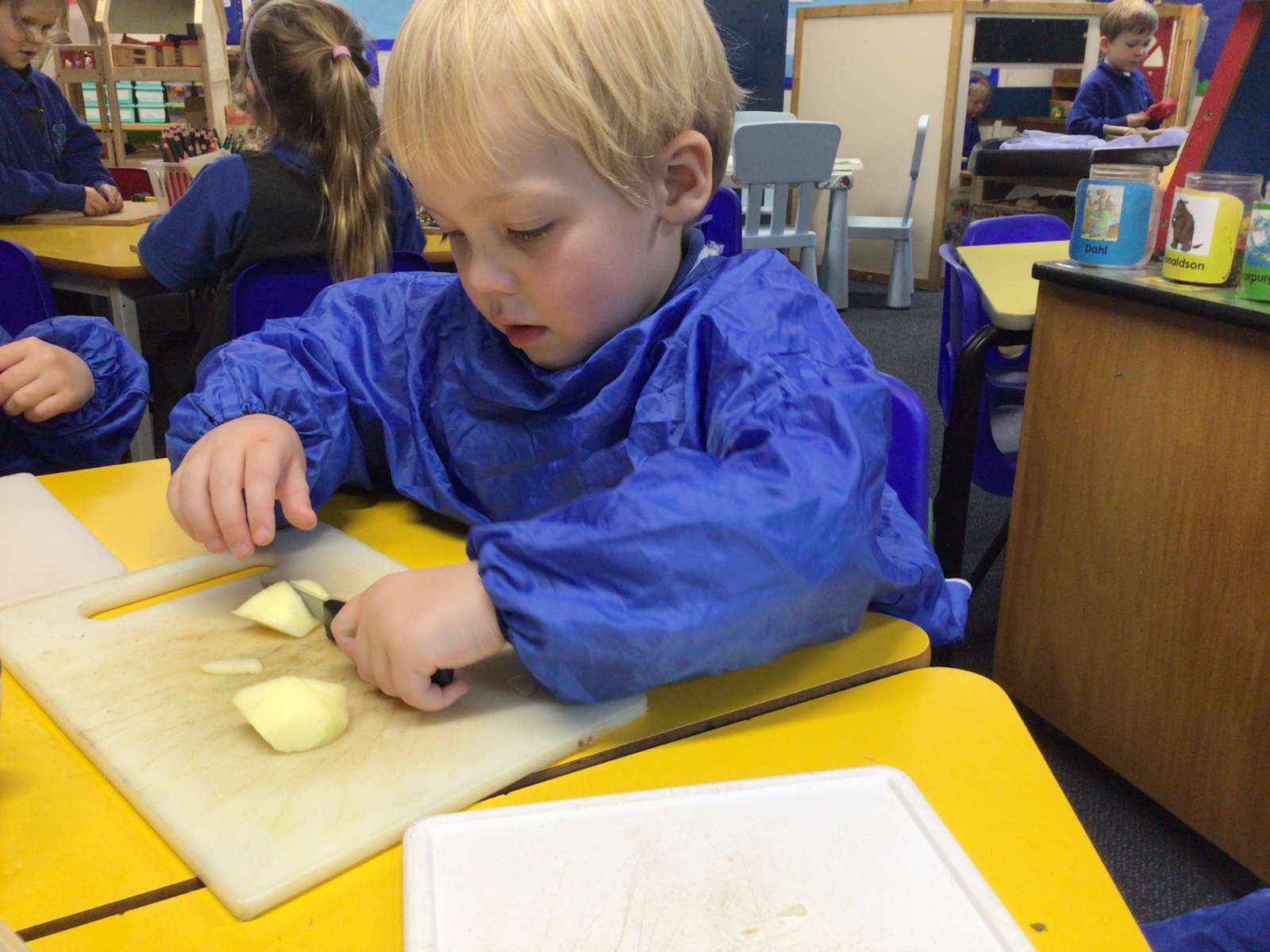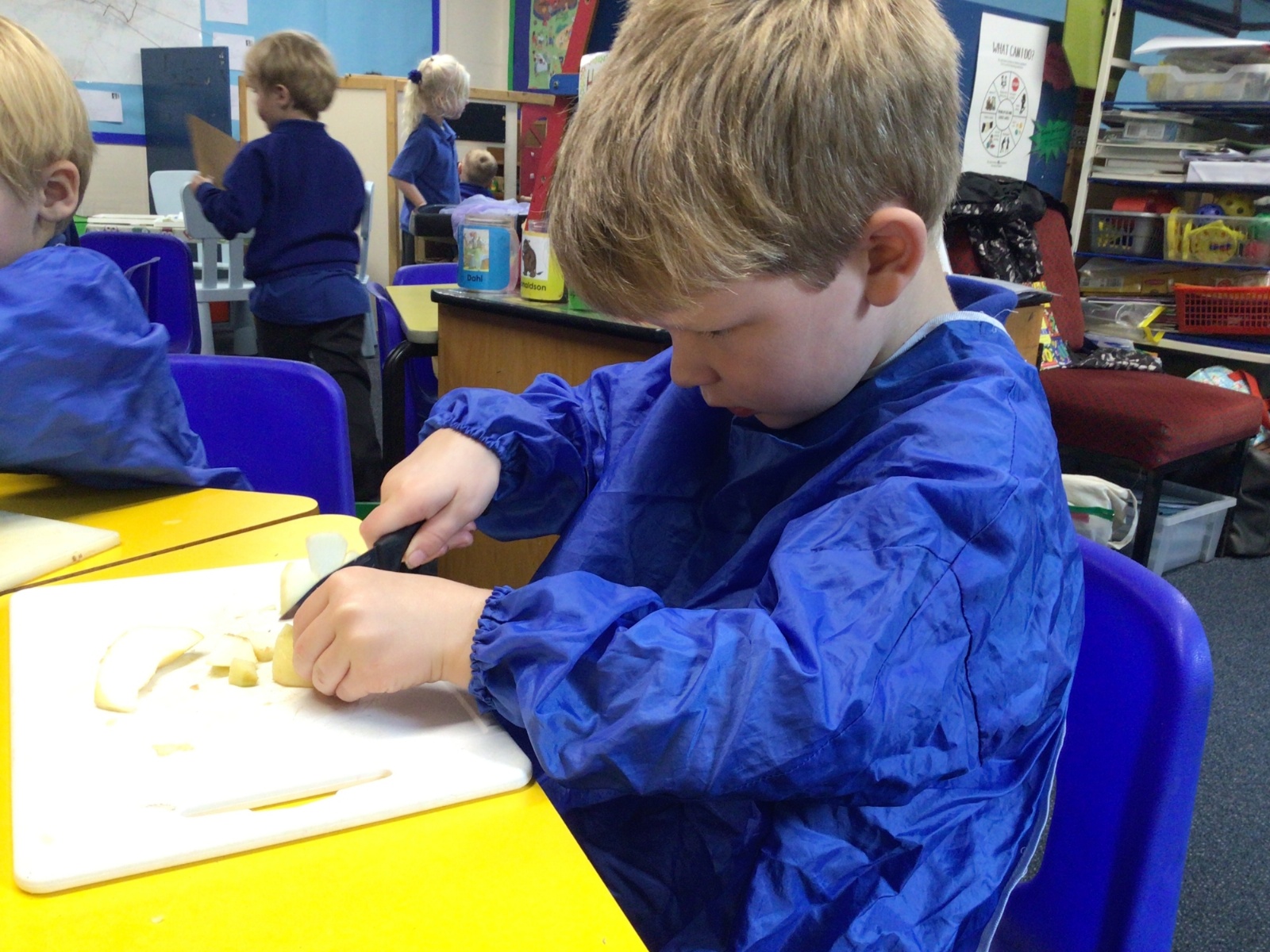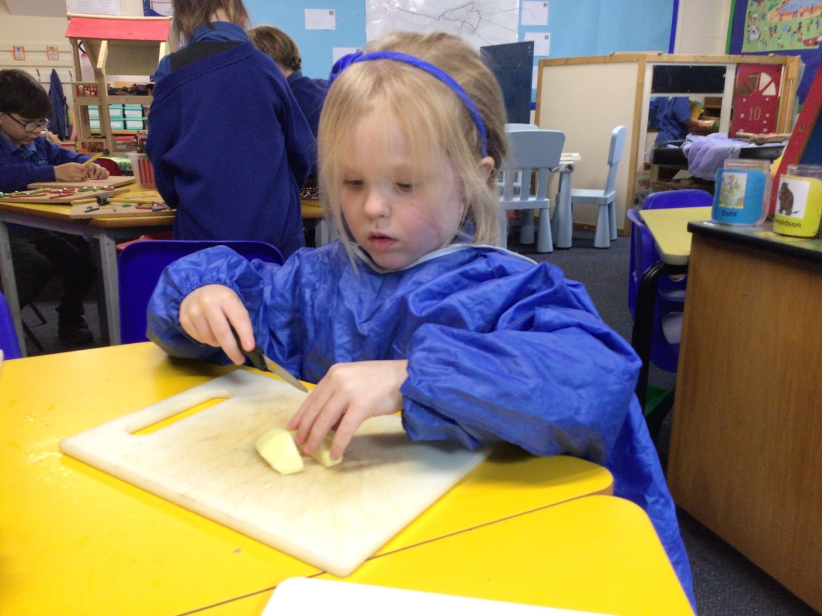 Year 1 picked blackberries and and then we all chopped apples to make a tasty, delicious crumble. We learnt how to chop carefully by making our fingers into a 'claw' and 'bridge'. It was yummy!!