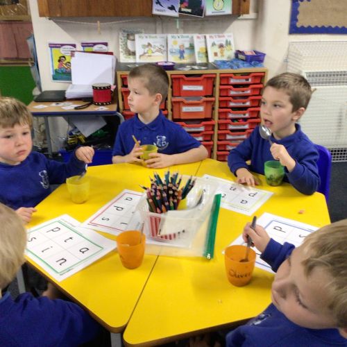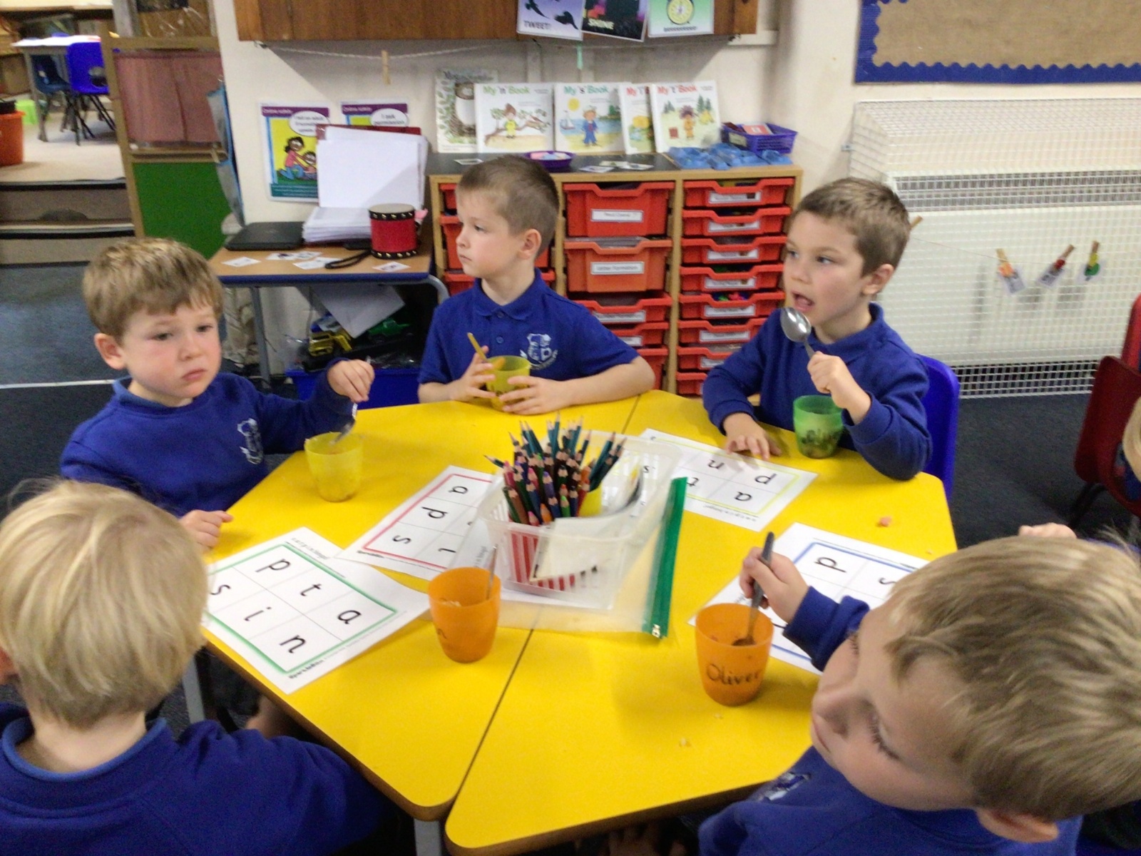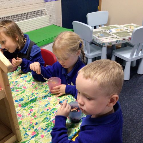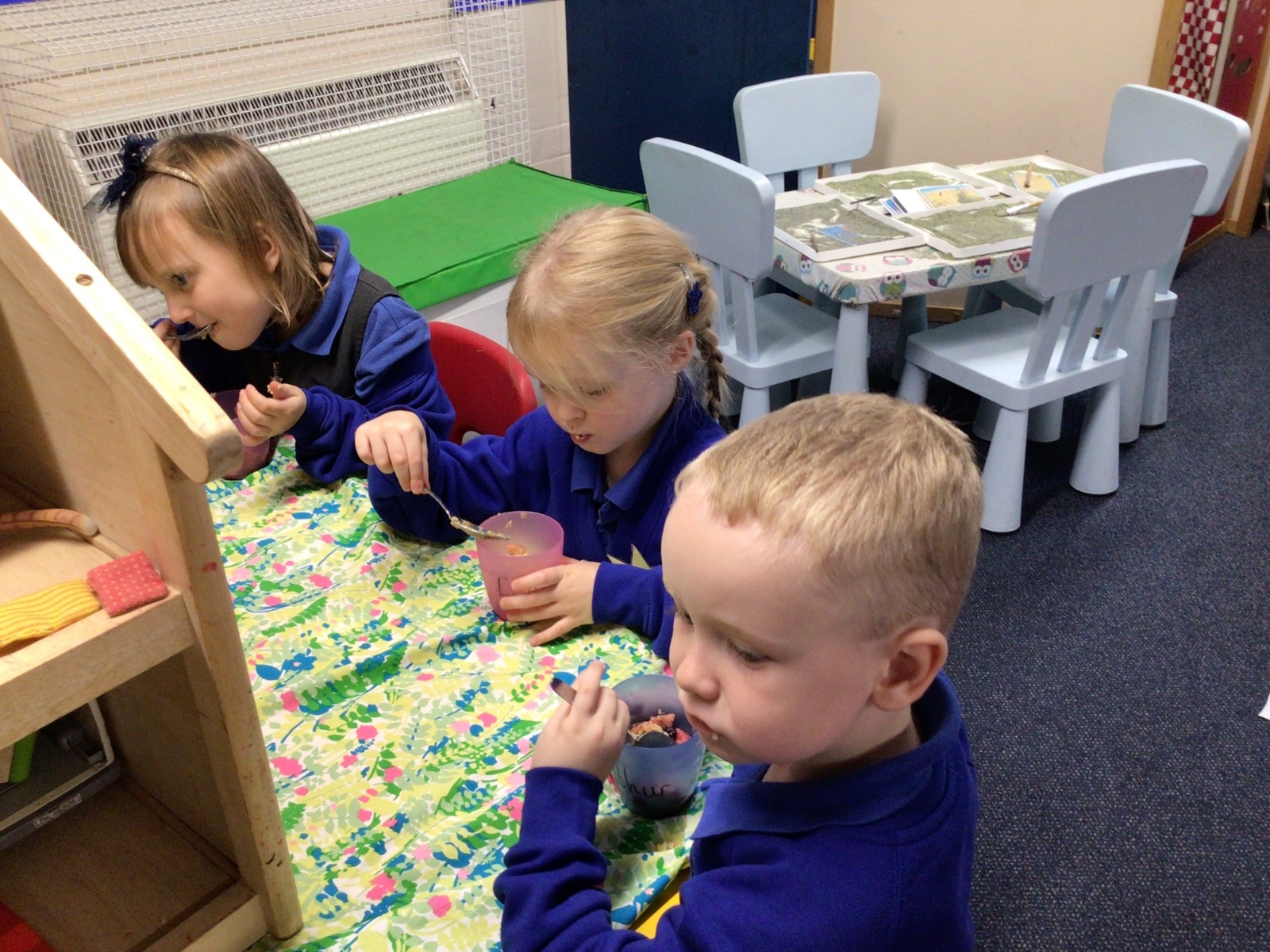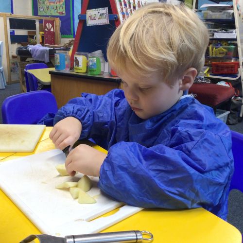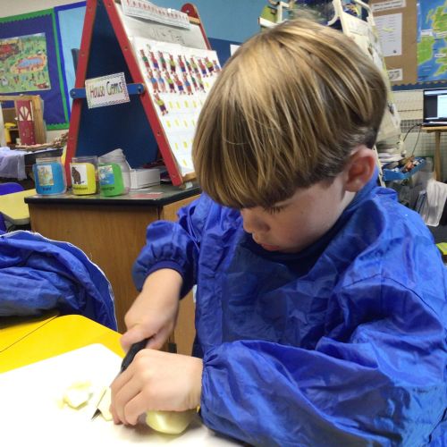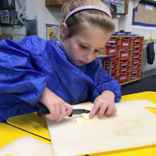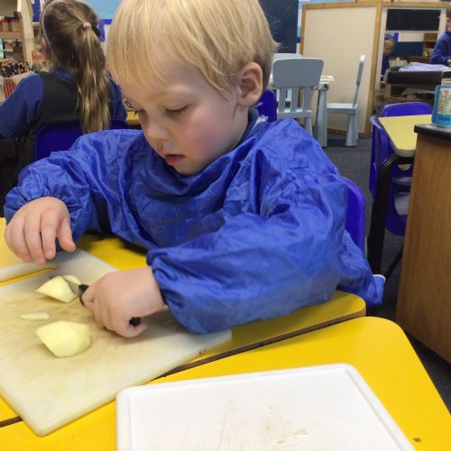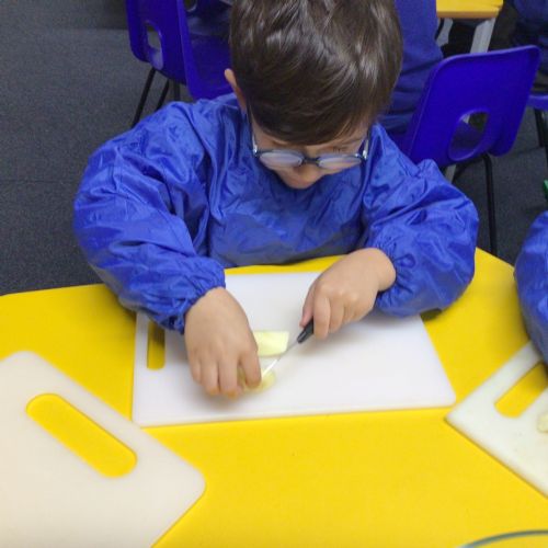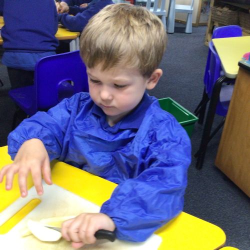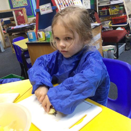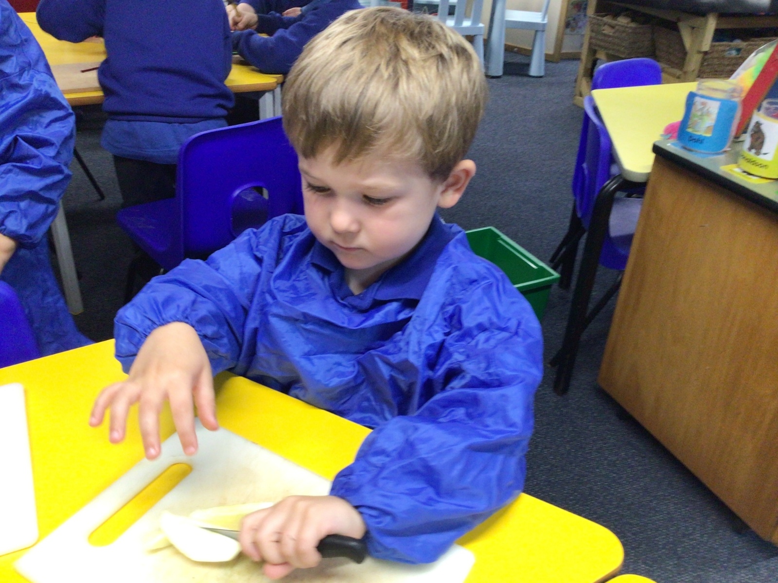 Year 1 picked blackberries and and then we all chopped apples to make a tasty, delicious crumble. We learnt how to chop carefully by making our fingers into a 'claw' and 'bridge'. It was yummy!!