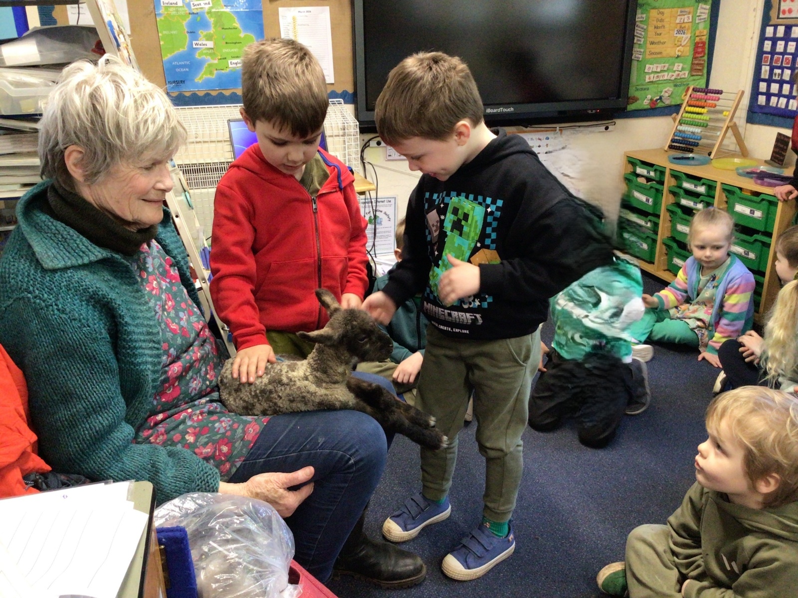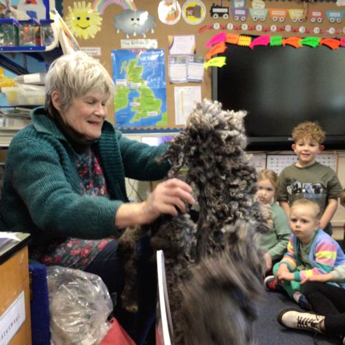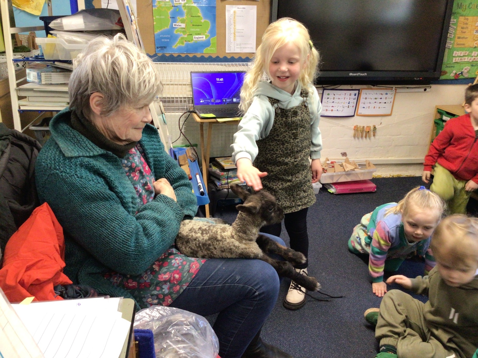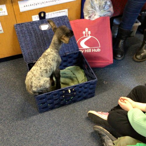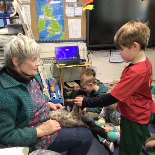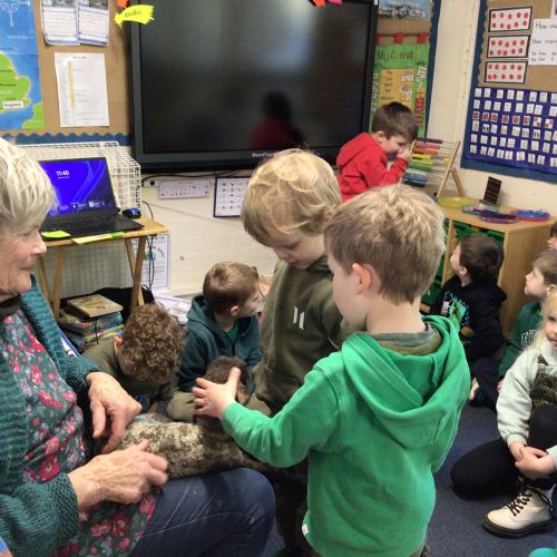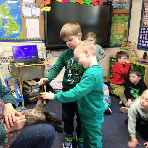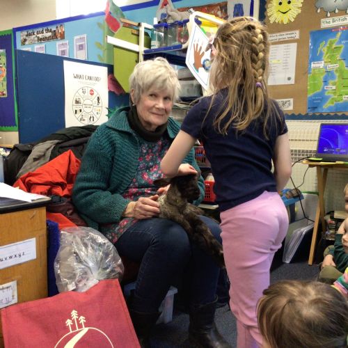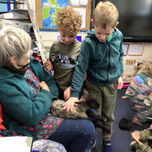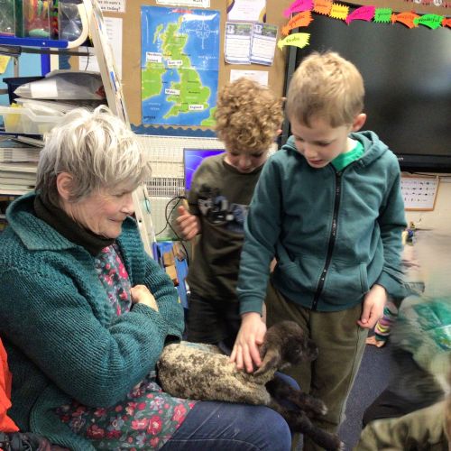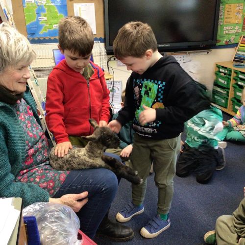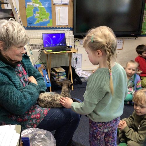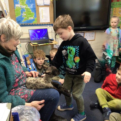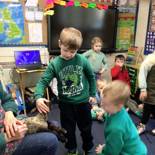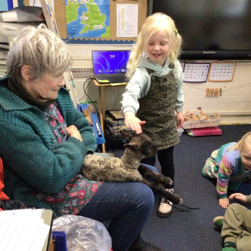 Mrs Credland brought a lamb to visit – we named her 'Lamb, Lamb' and watched her drink milk from a bottle. We learnt how a fleece from a sheep was used to make a woolly jumper.