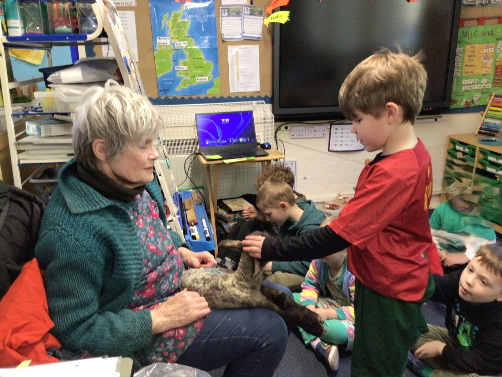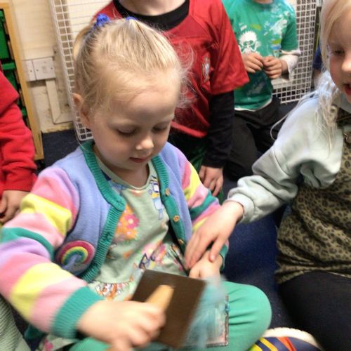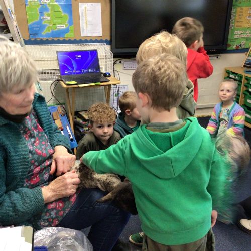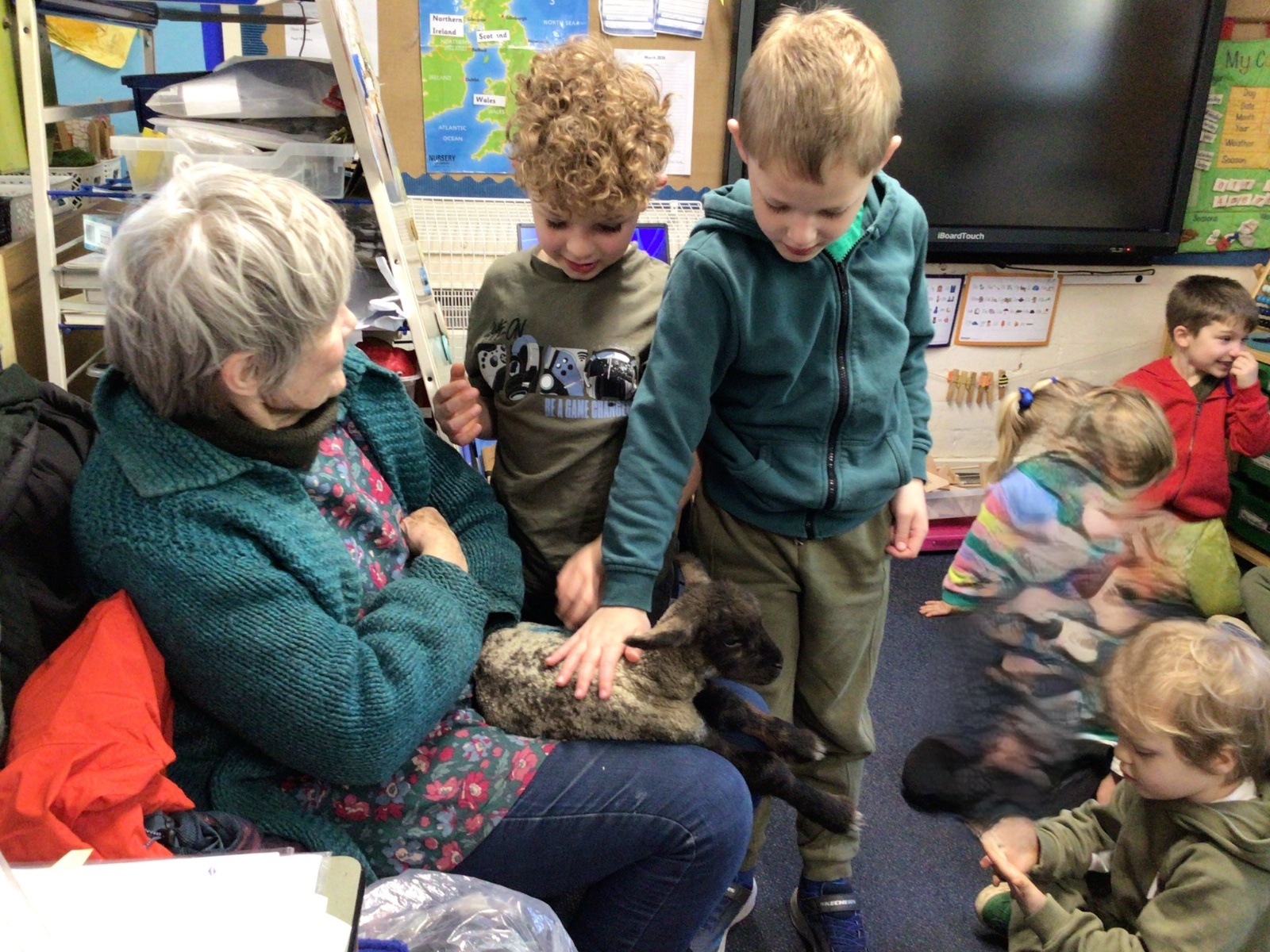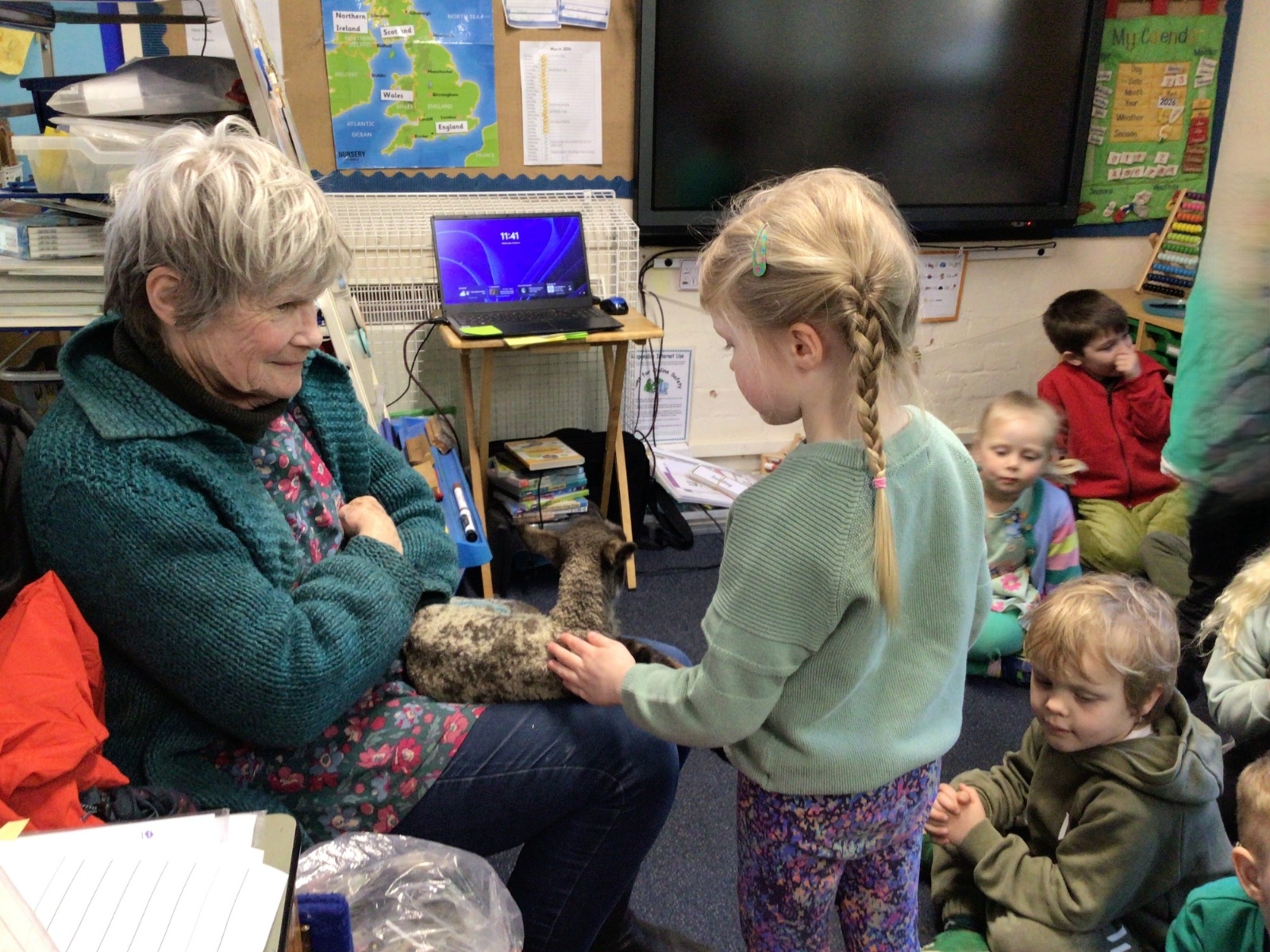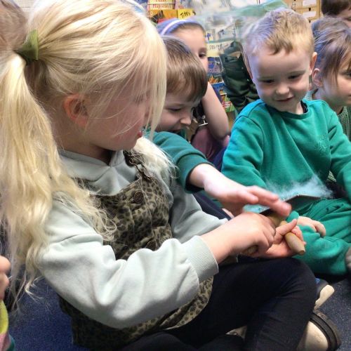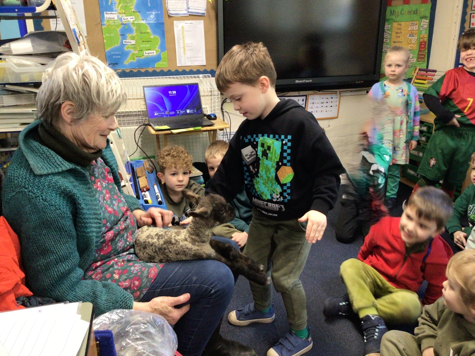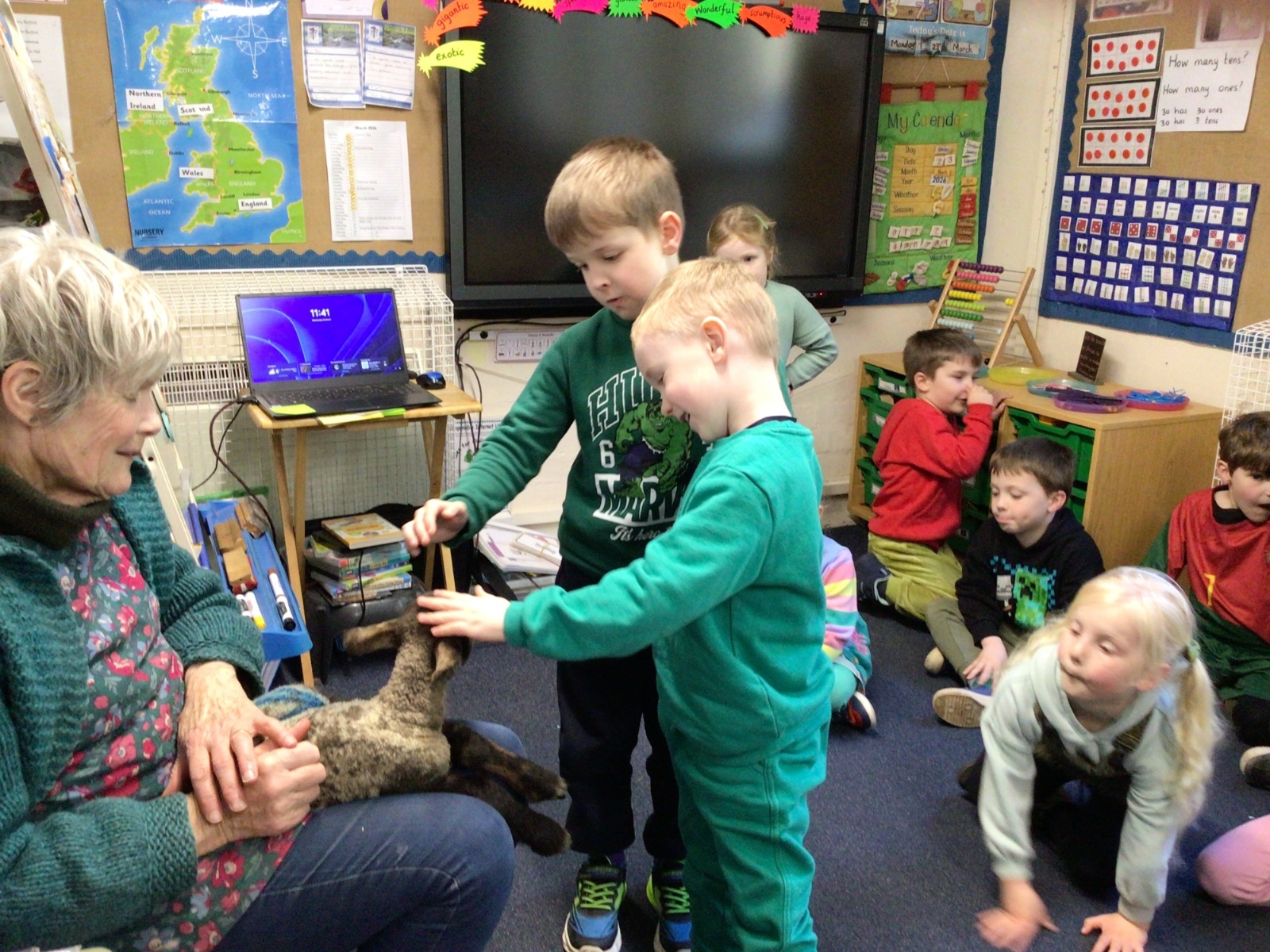 Mrs Credland brought a lamb to visit – we named her 'Lamb, Lamb' and watched her drink milk from a bottle. We learnt how a fleece from a sheep was used to make a woolly jumper.