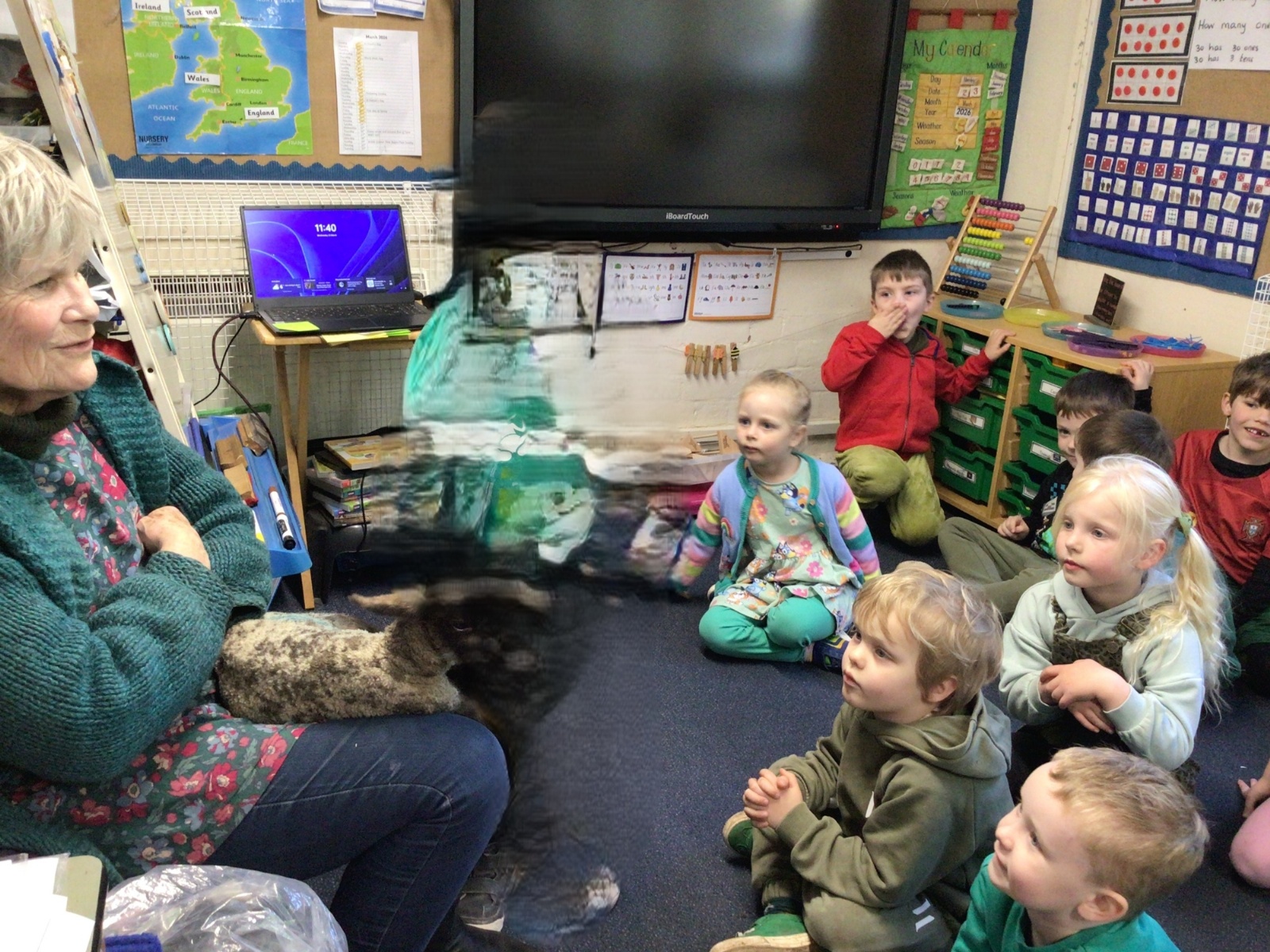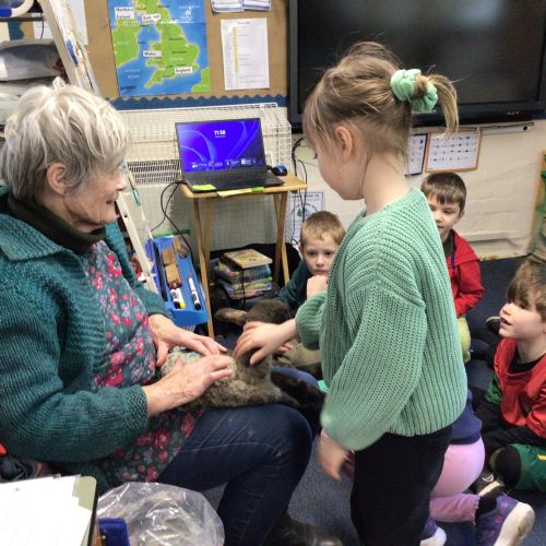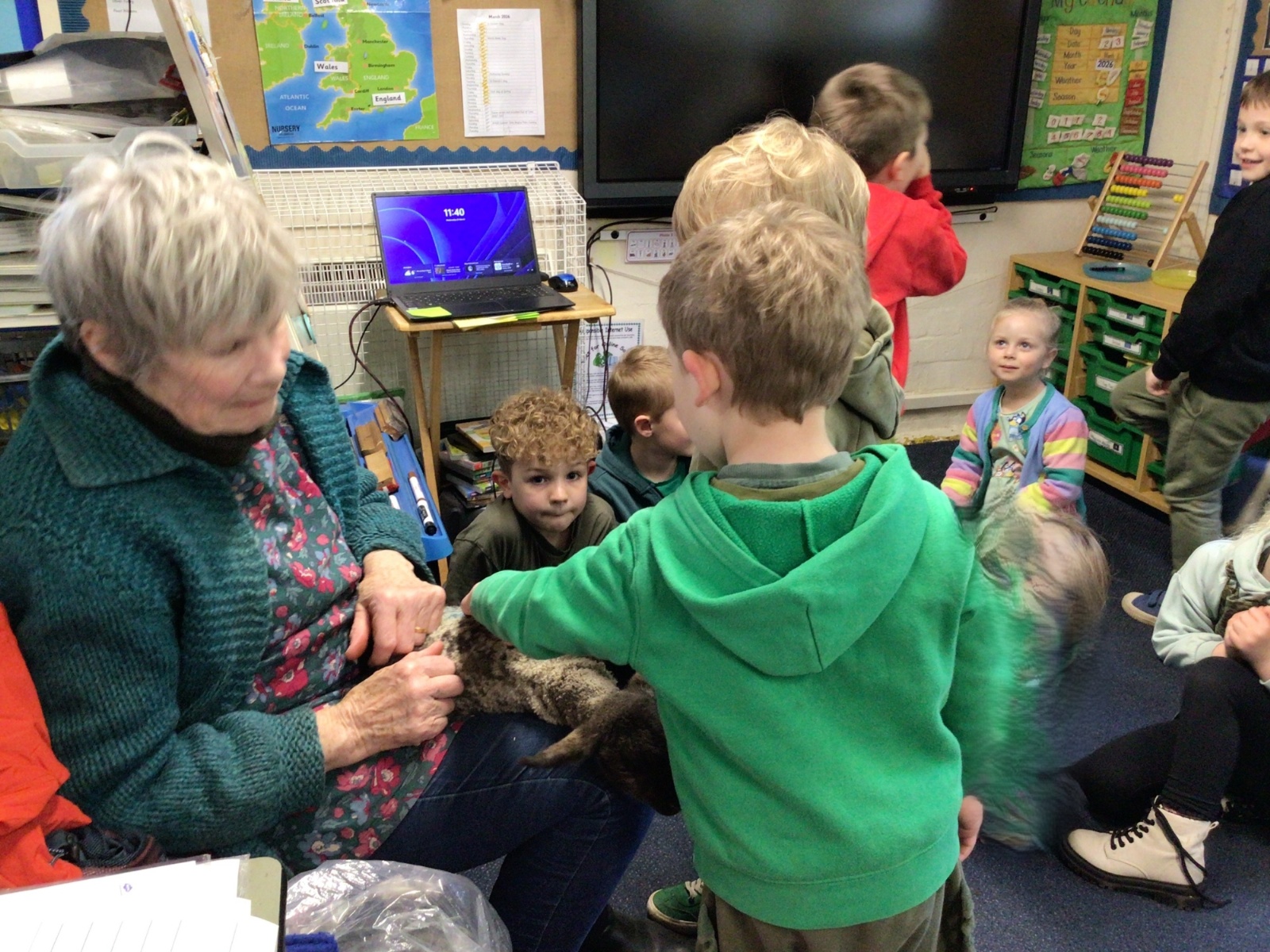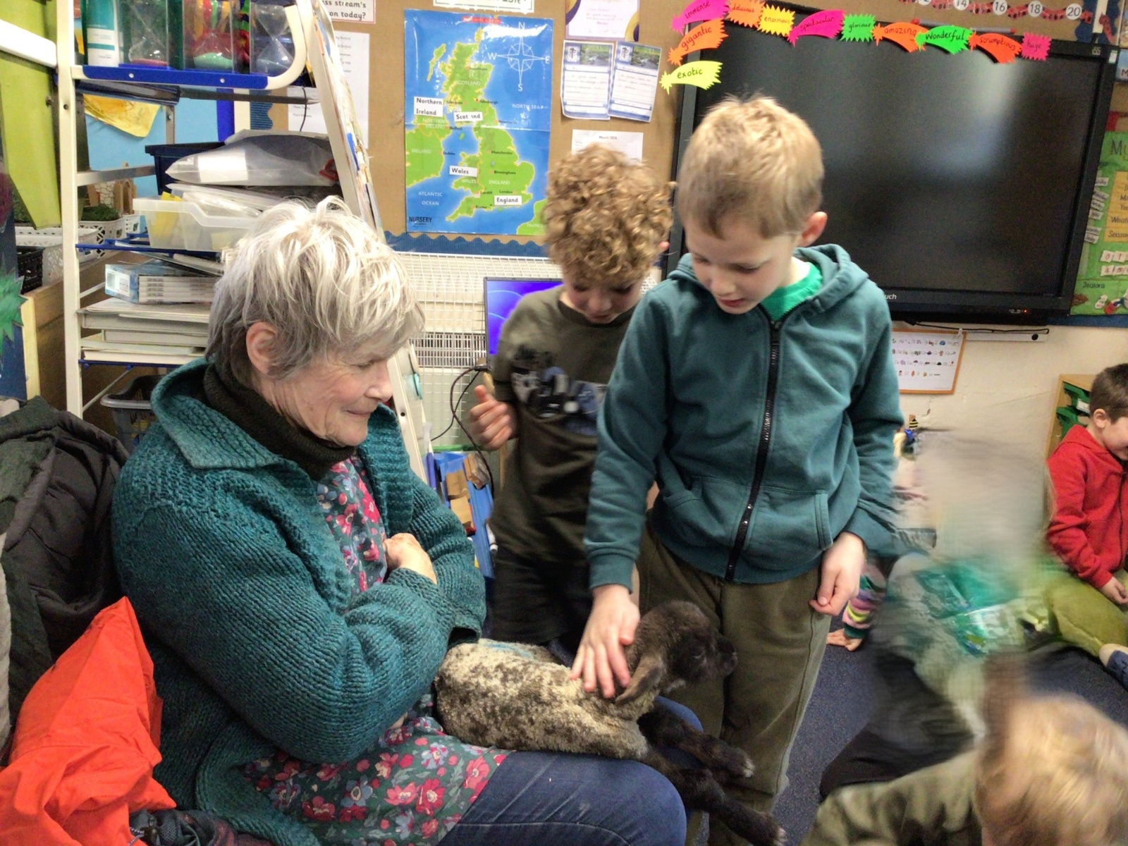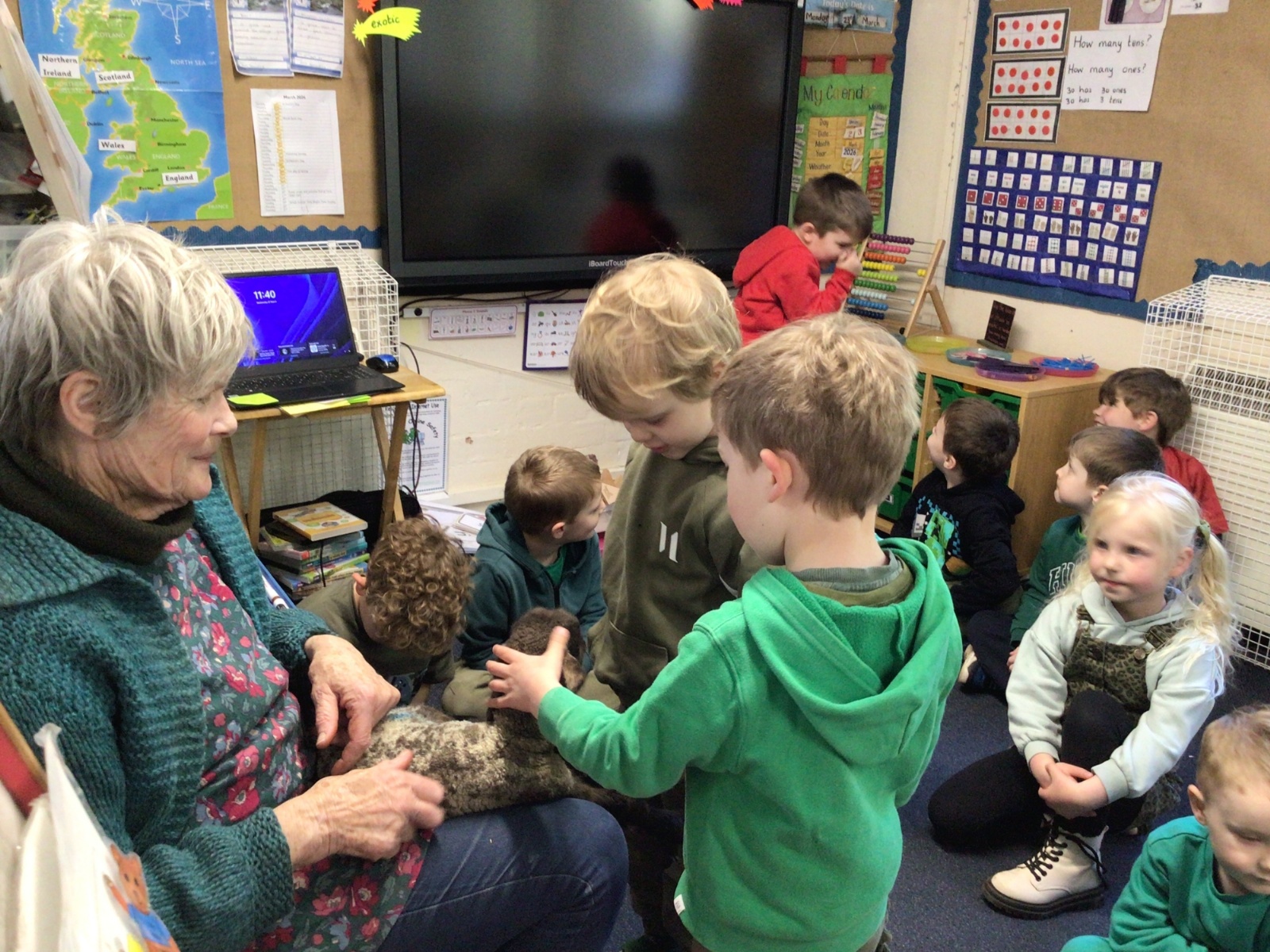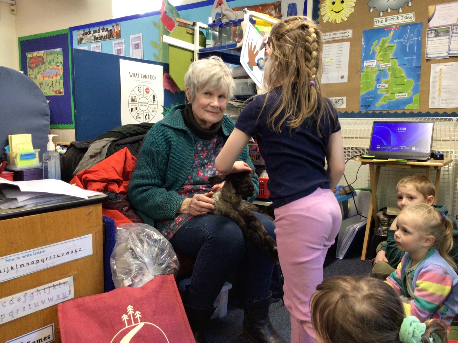 Mrs Credland brought a lamb to visit – we named her 'Lamb, Lamb' and watched her drink milk from a bottle. We learnt how a fleece from a sheep was used to make a woolly jumper.