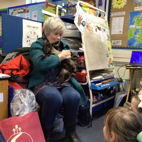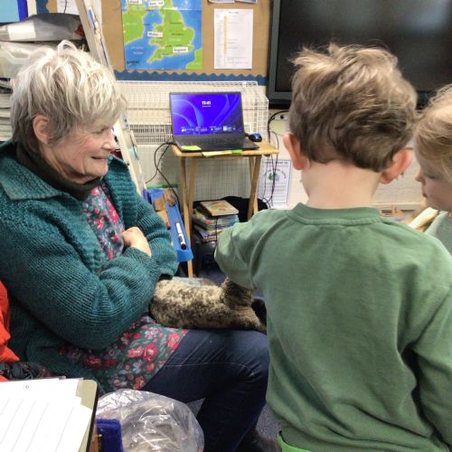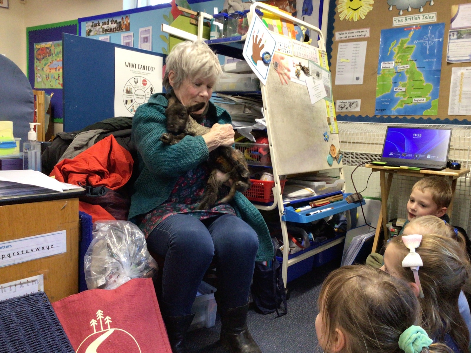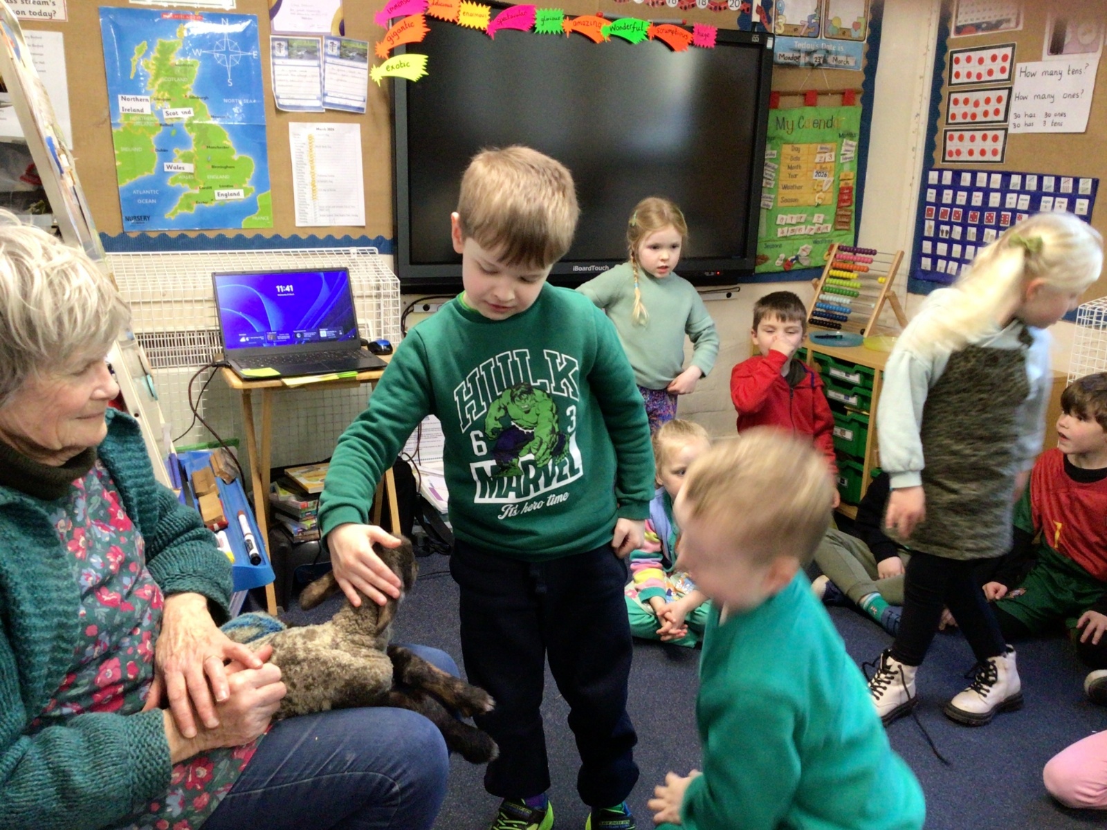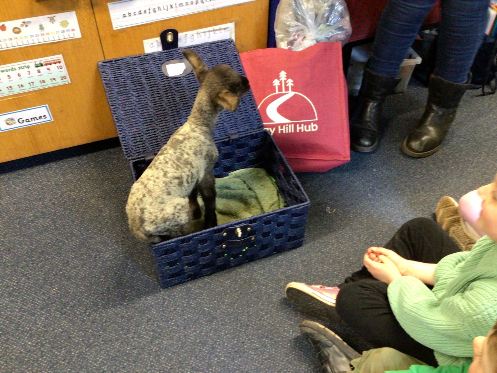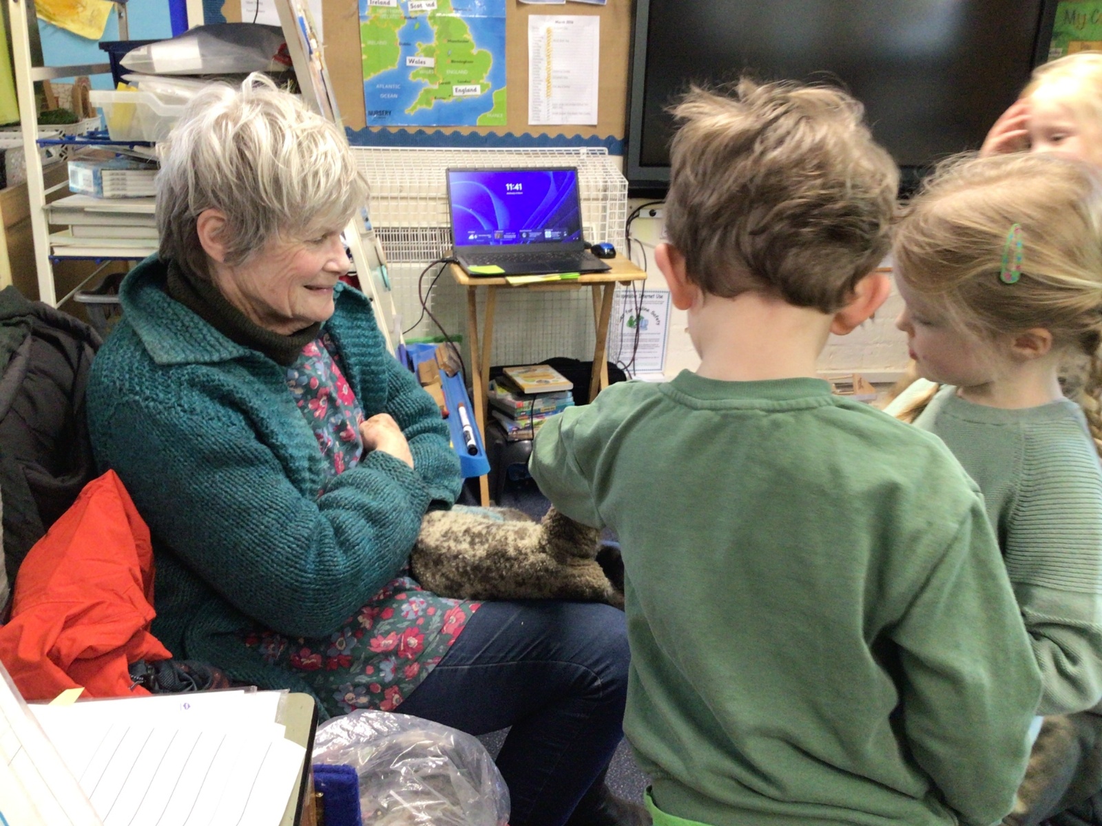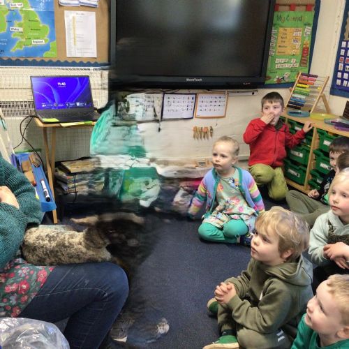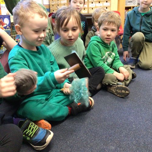Mrs Credland brought a lamb to visit – we named her 'Lamb, Lamb' and watched her drink milk from a bottle. We learnt how a fleece from a sheep was used to make a woolly jumper.