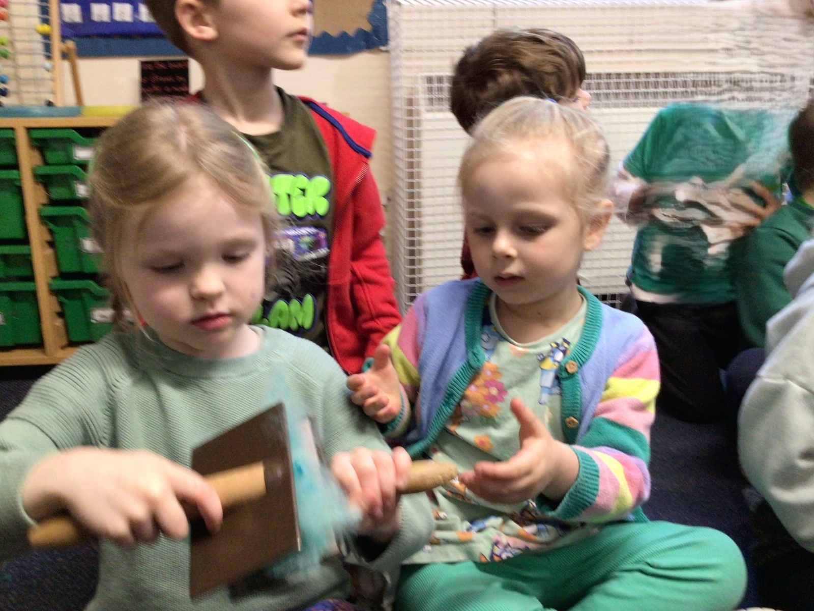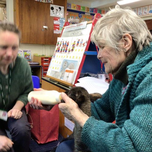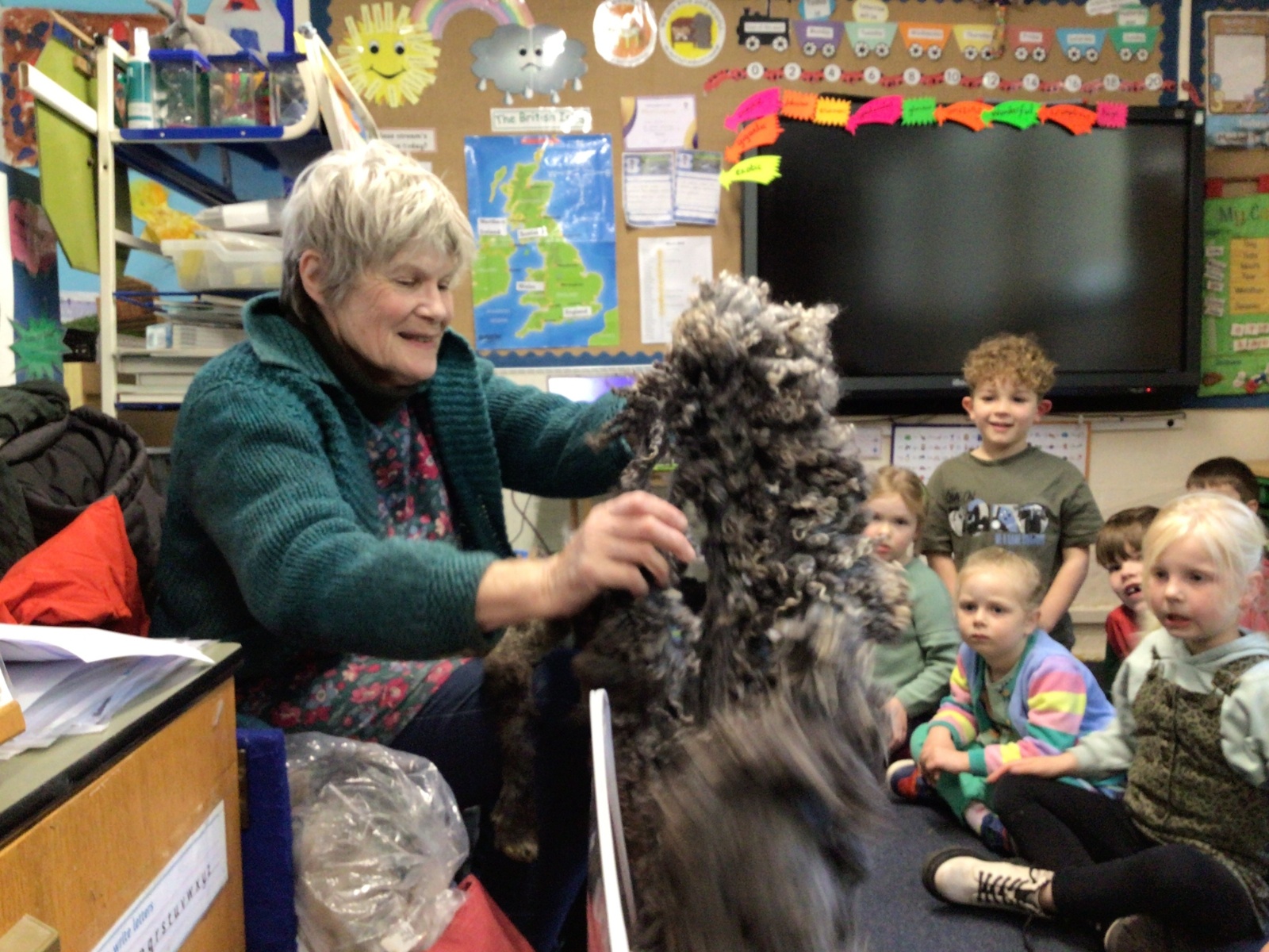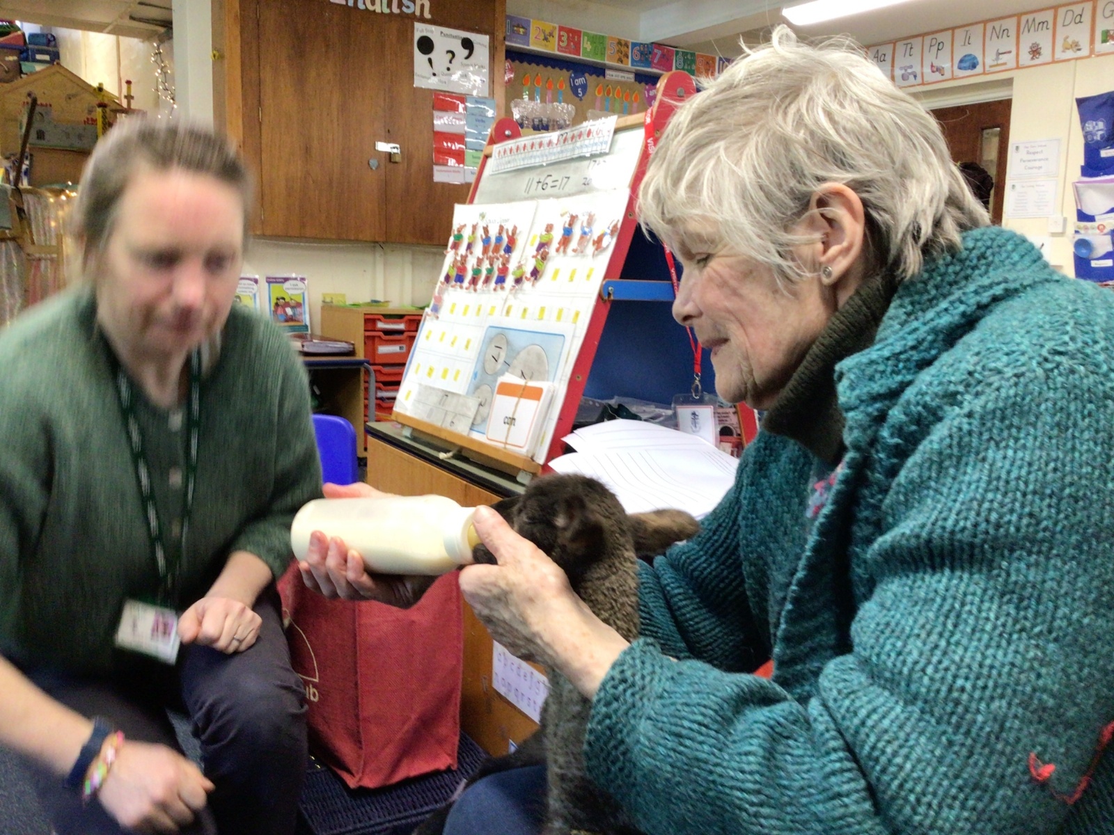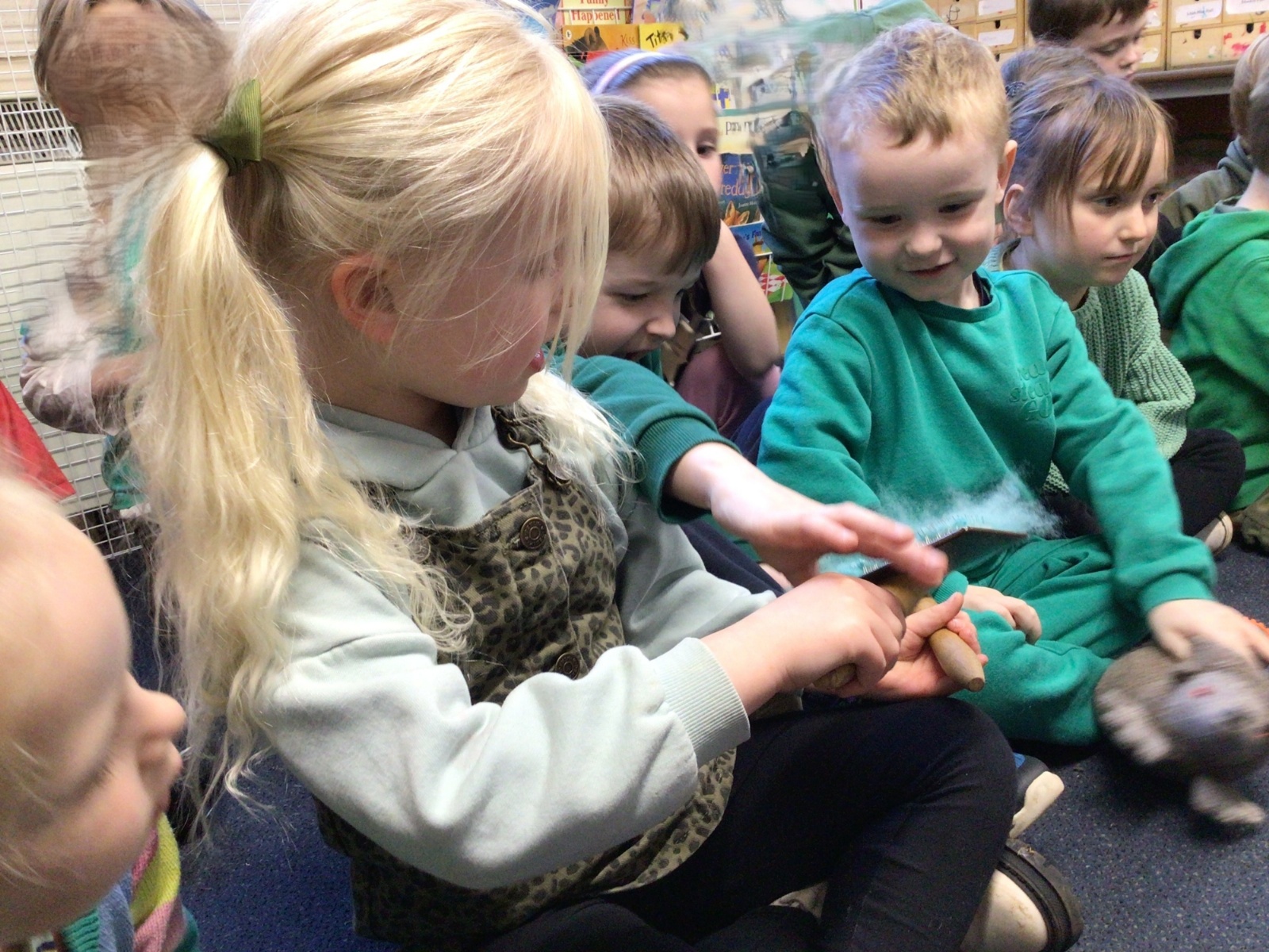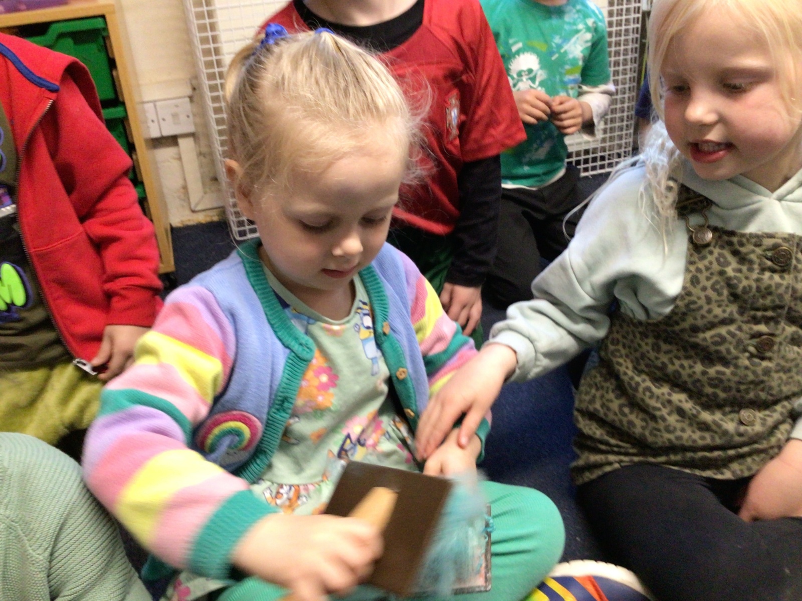 Mrs Credland brought a lamb to visit – we named her 'Lamb, Lamb' and watched her drink milk from a bottle. We learnt how a fleece from a sheep was used to make a woolly jumper.