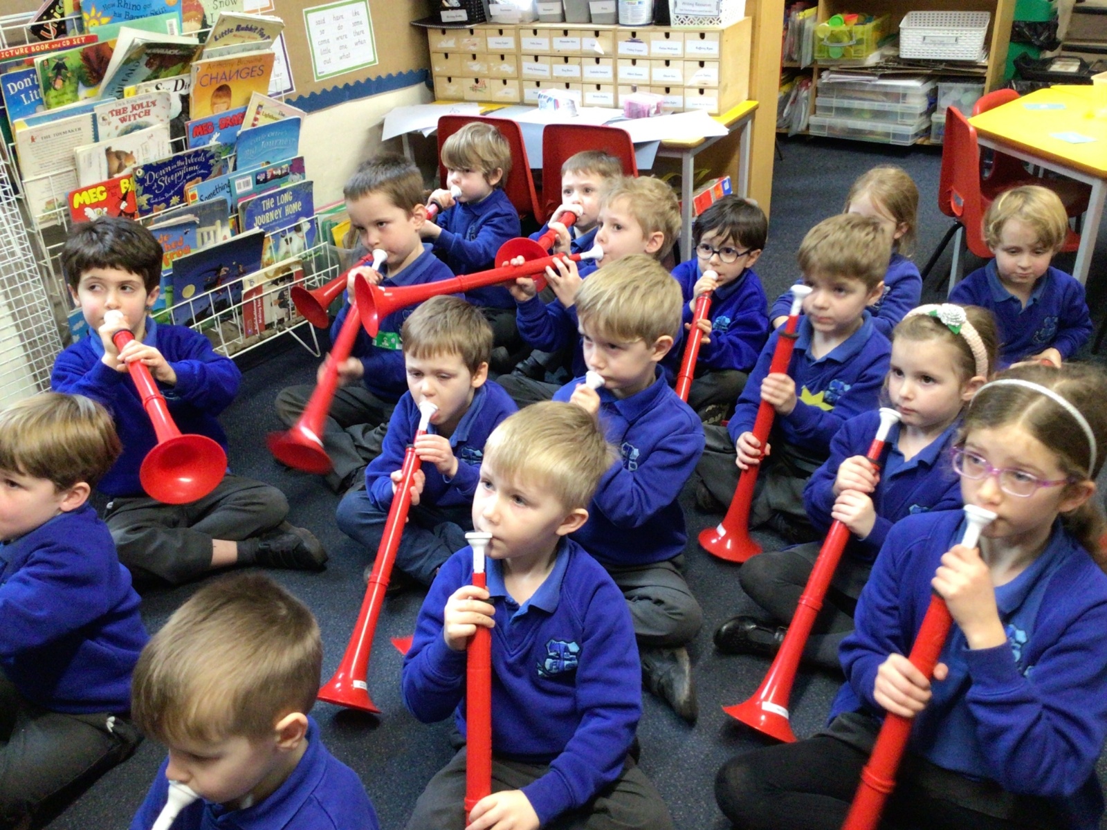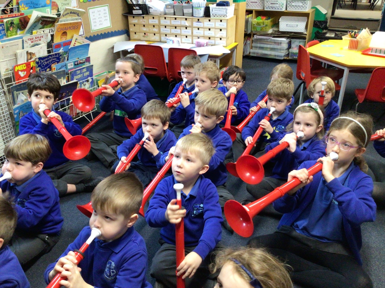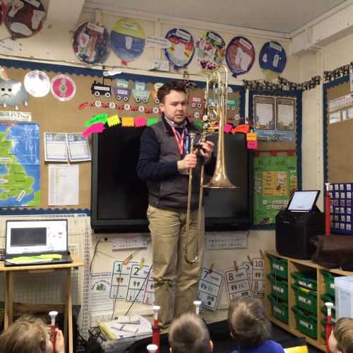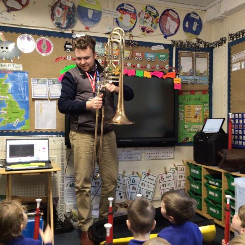Peter came to teach us how to play an instrument called a 'P Buzz', it is like learning to play the trumpet or trombone. It was very loud and exciting when he played his trombone for us.