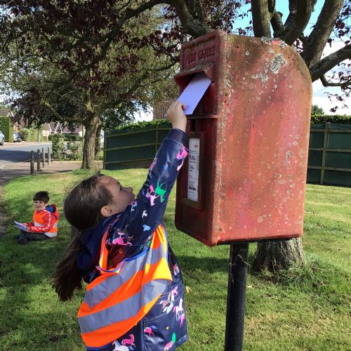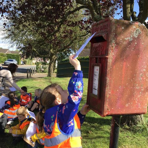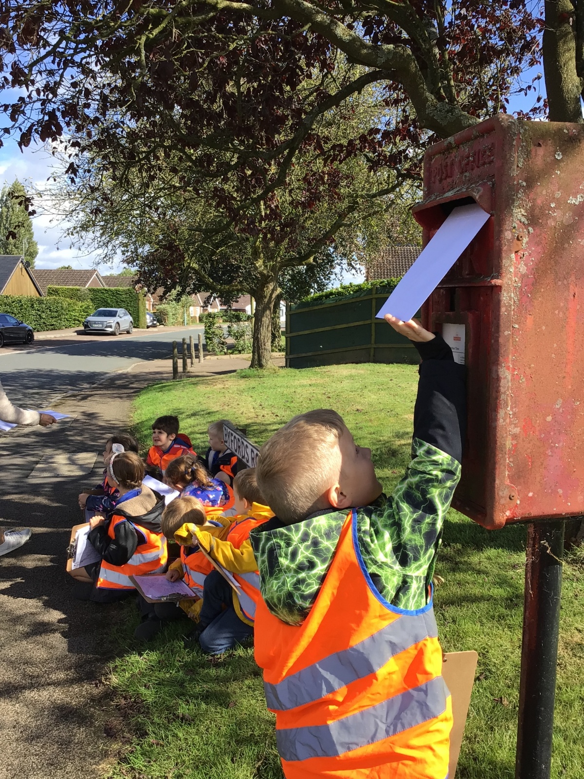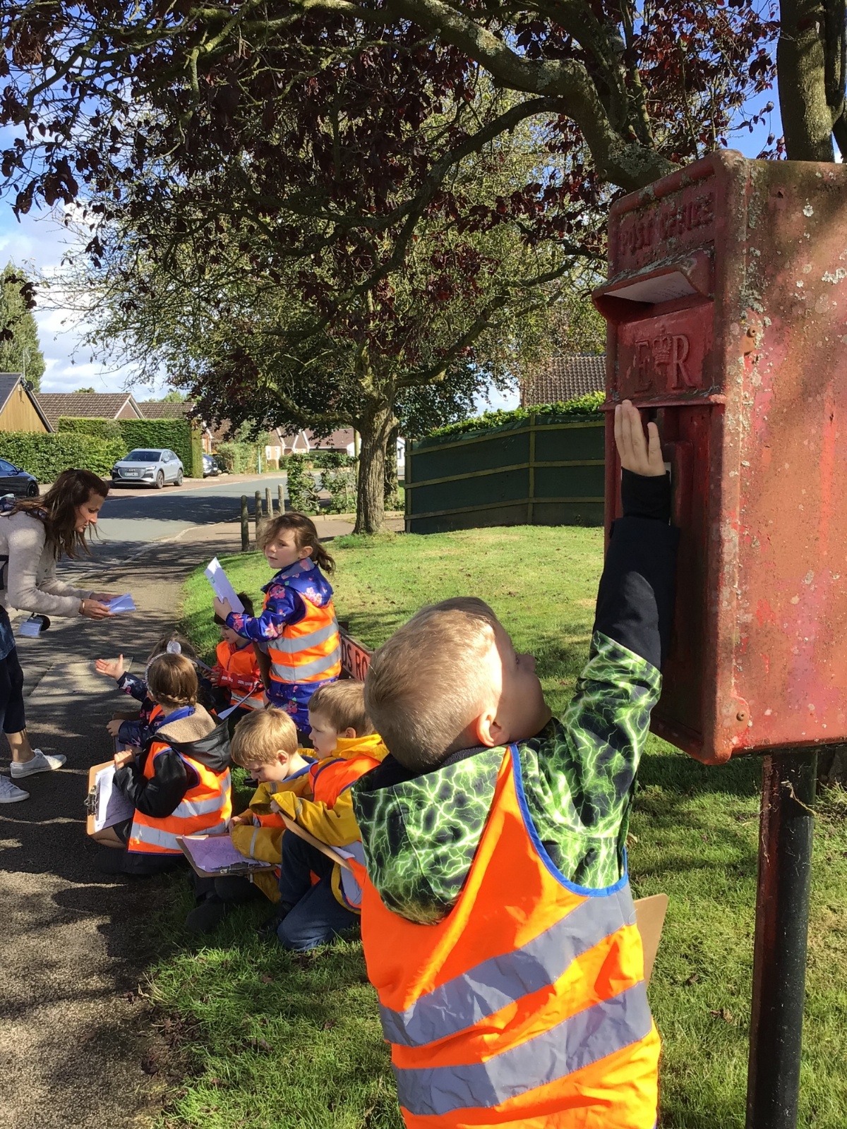 Year 1 went on a walk to find out about the village of Huntley. We followed a map and looked at the different houses and other buildings such as the village hall, pub, butchers and garage. We found a postbox and posted a letter to our house.