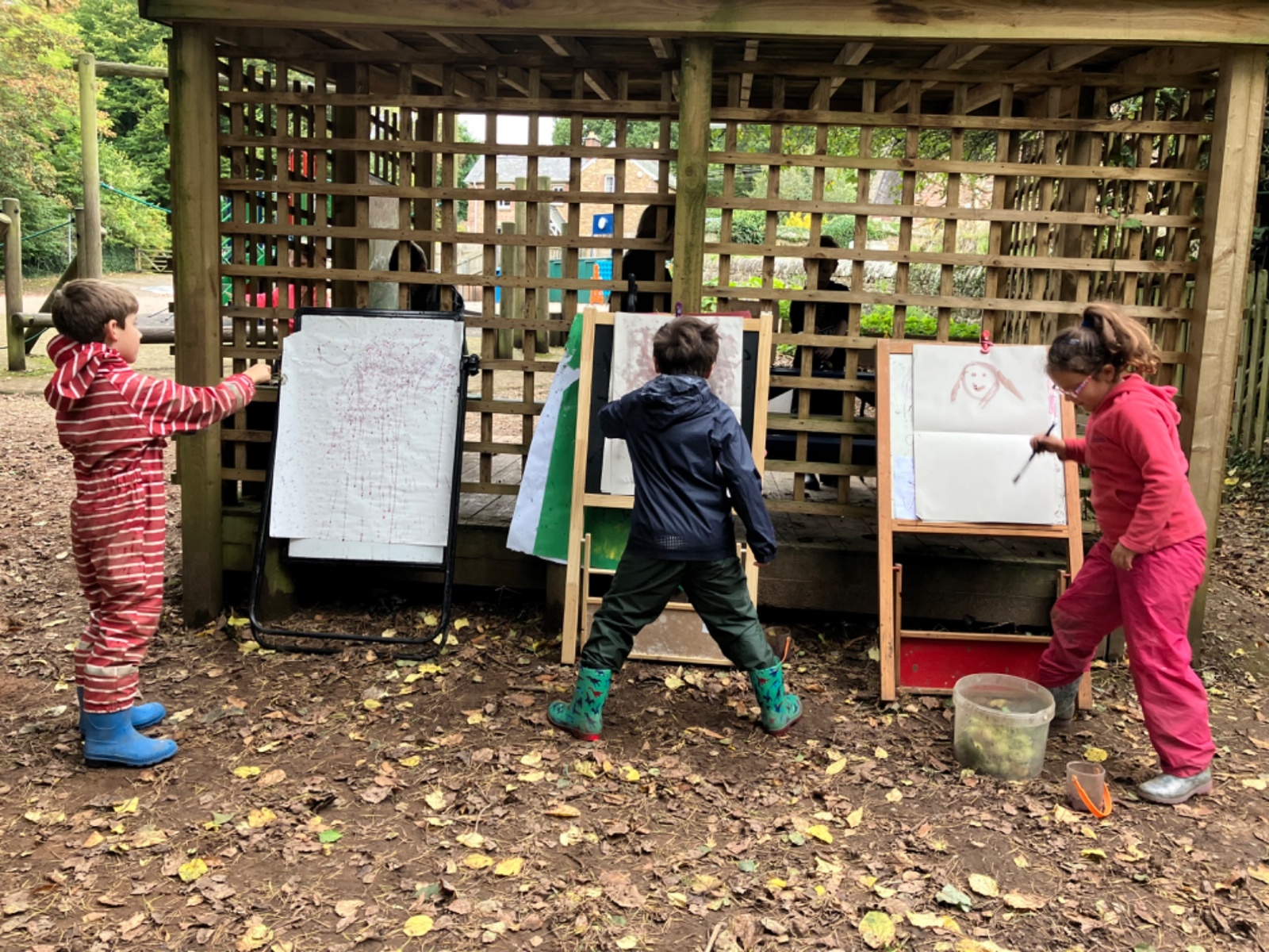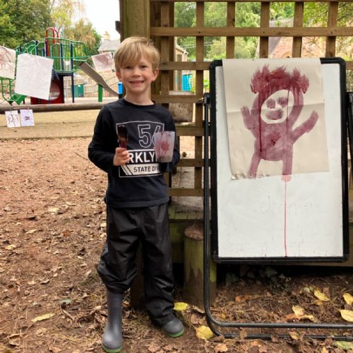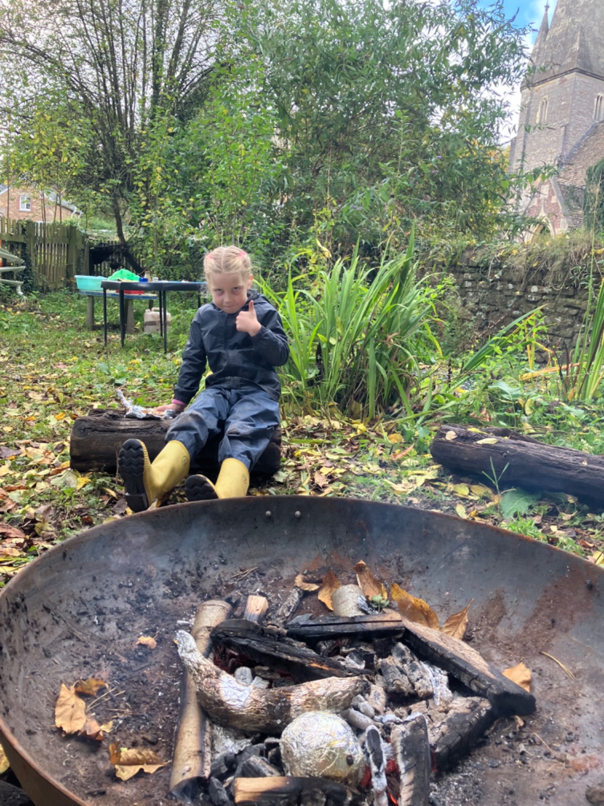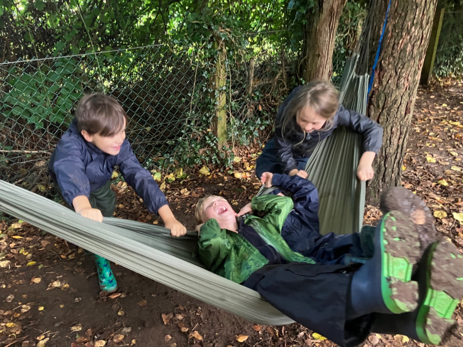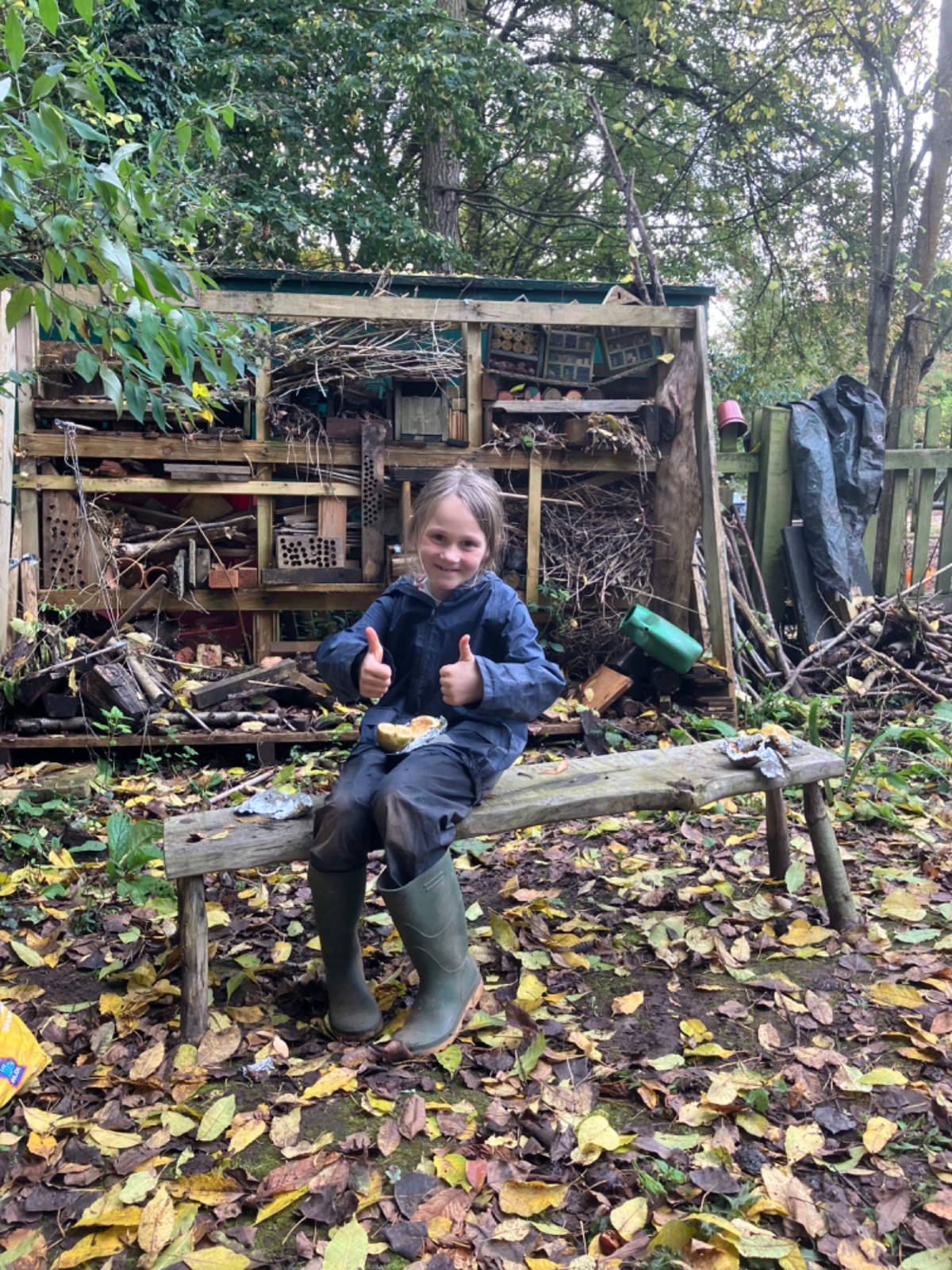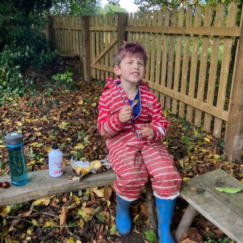 Hammocks, trench digging, conkers, blackberry painting, boats, and collecting firewood in the forest, baked apples and bananas, conker jewellery and a thank you in sticks for Mrs Garbutt : )